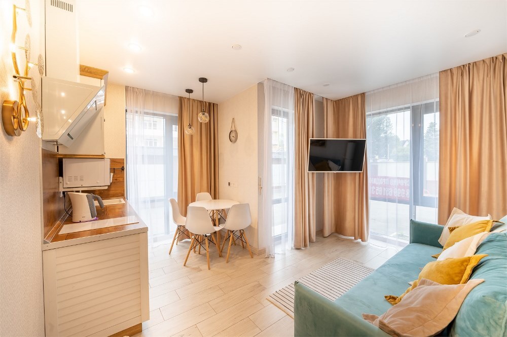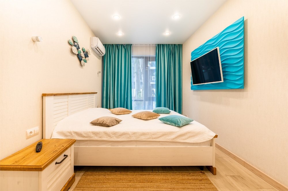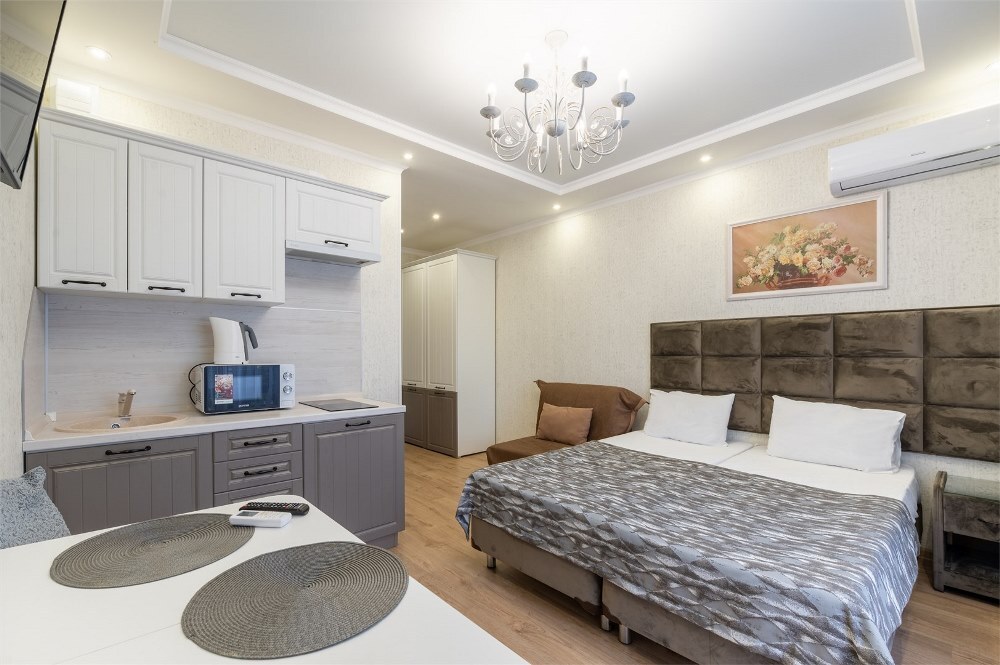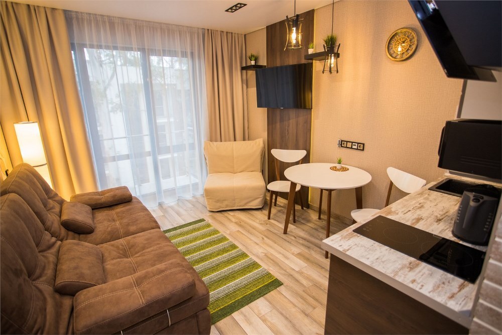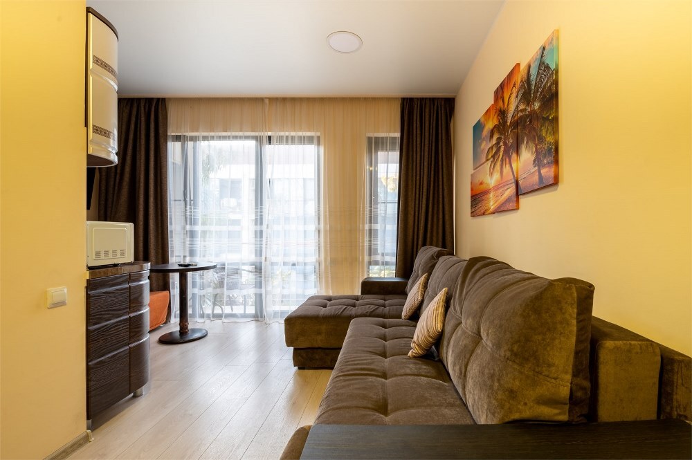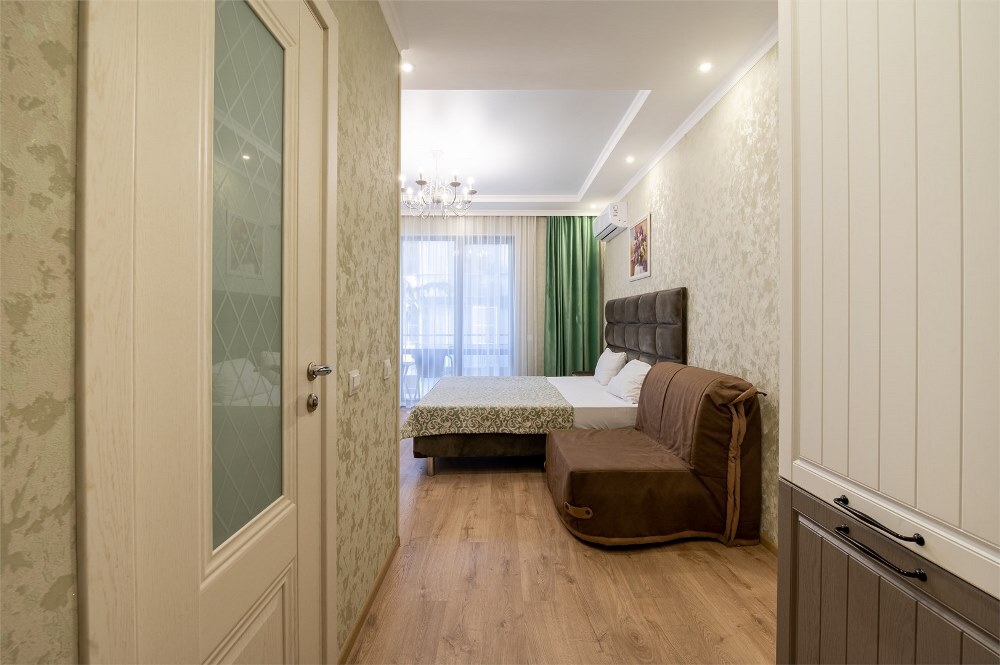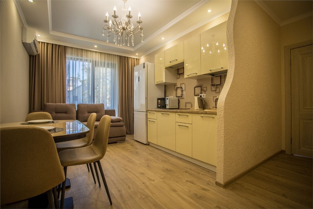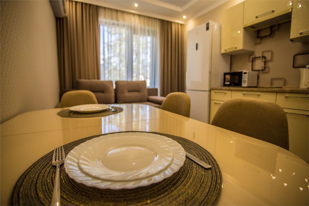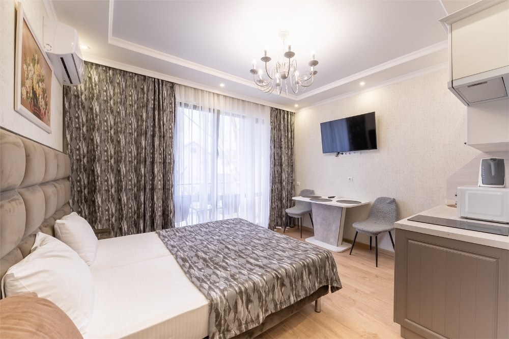 Современный трехэтажный корпус отеля занимает закрытую благоустроенную территорию на первой береговой линии. Гостям предлагаются комфортабельные апартаменты со стильными дизайнерскими интерьерами. Все номера оснащены кухней, имеется необходимая бытовая техника, включая кондиционер и стиральную машину.