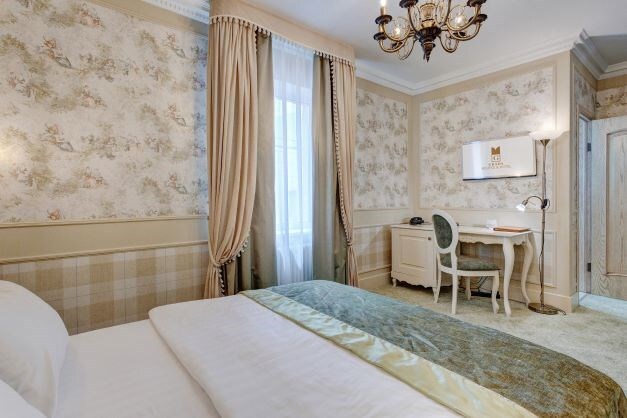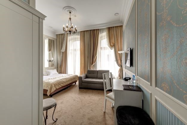 Отель разместился на знаменитой пешеходной улице Кузнецкий мост, в трехэтажном историческом особняке, выстроенном еще в XVIII столетии. Гостей ожидают двухместные номера категории Стандарт, Комфорт, Люкс. В номерах изящный классический интерьер. В каждой комнате есть кондиционер, санузел с душем, фен, телевизор-ЖК.