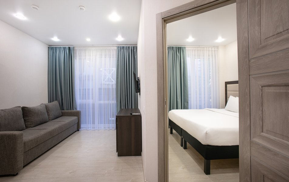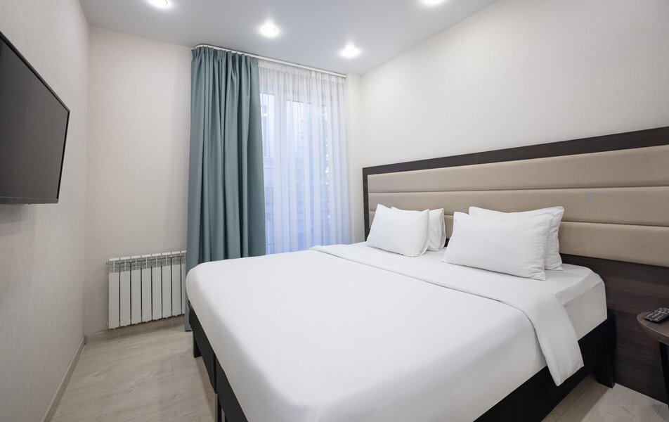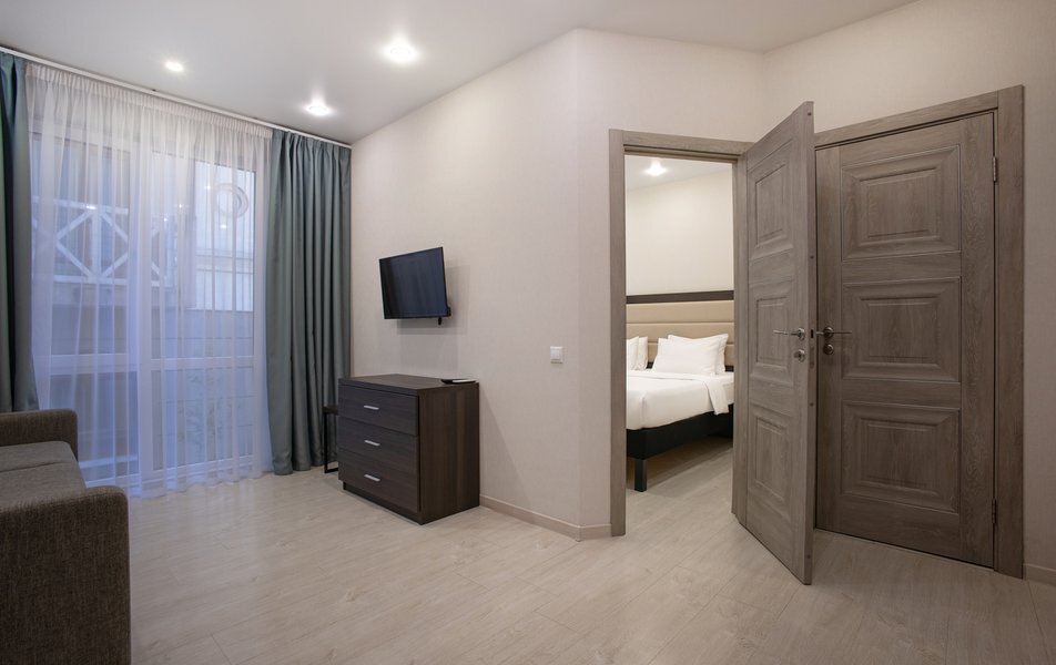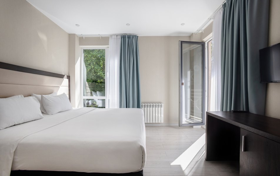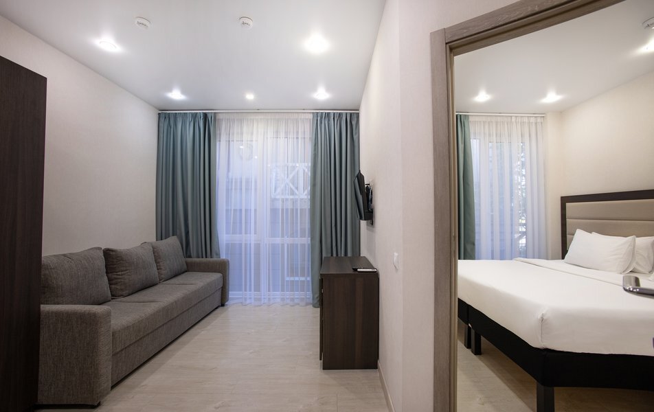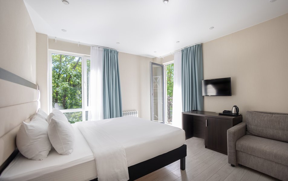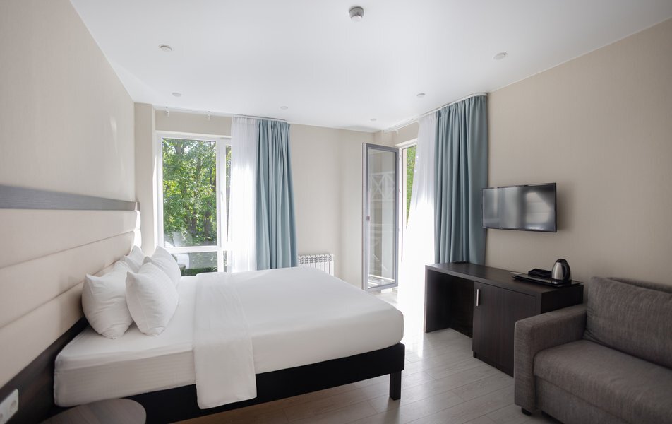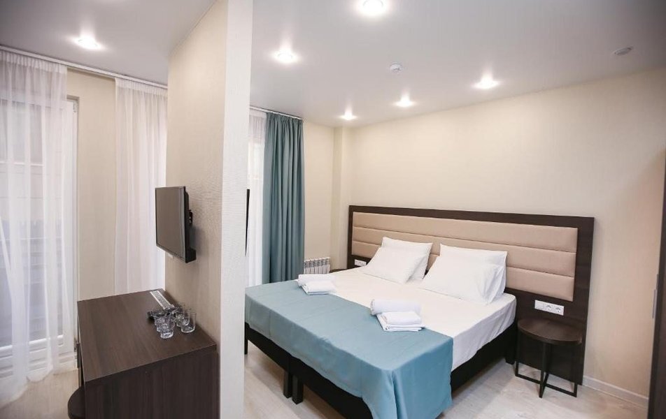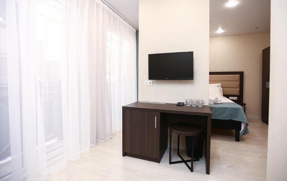 В 3-этажном здании оборудованы номера разной вместимости и уровня комфорта. Все комнаты оформлены в современном стиле. Для удобства гостей установлена удобная спальная мебель, стол и большой шкаф для хранения одежды, есть кондиционер, телевизор со спутниковыми каналами, чайная станция, работает Wi-Fi. Санузел с душем, феном, халатами и полотенцами. На свежем воздухе обустроена красивая зона со столиками и стульями для отдыха. Стойка регистрации работает круглосуточно.