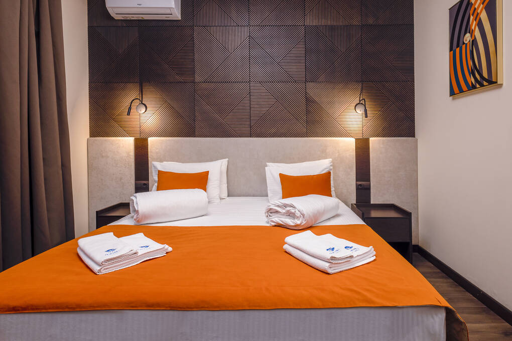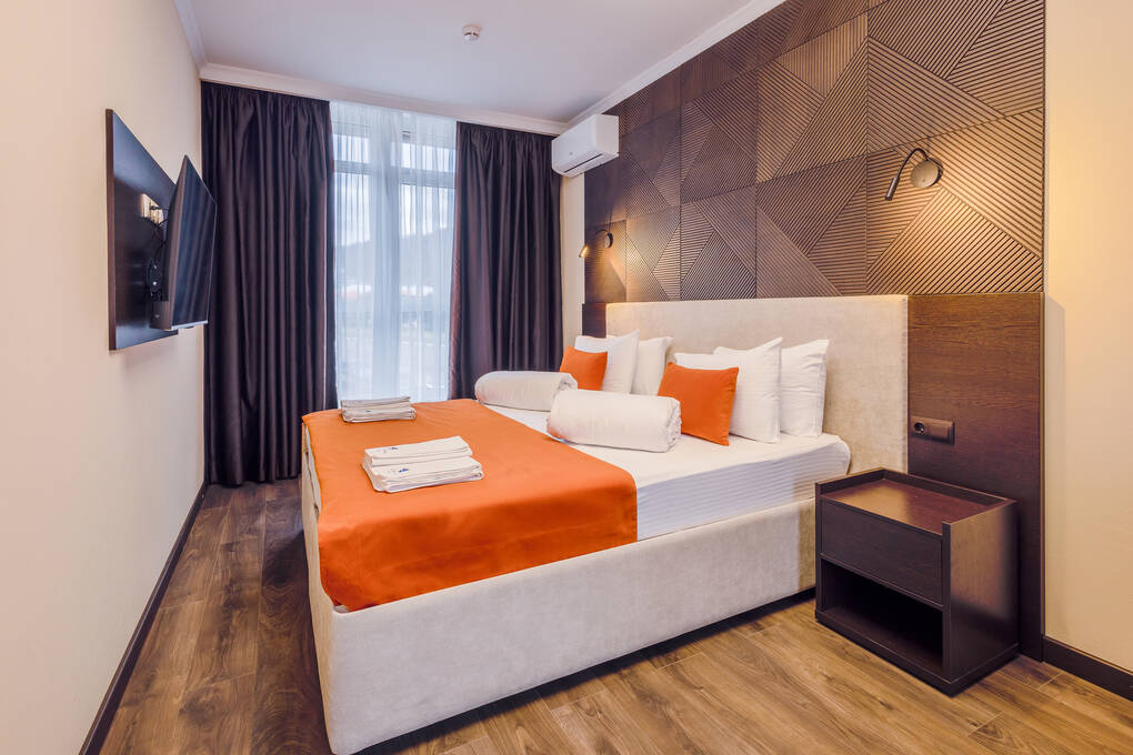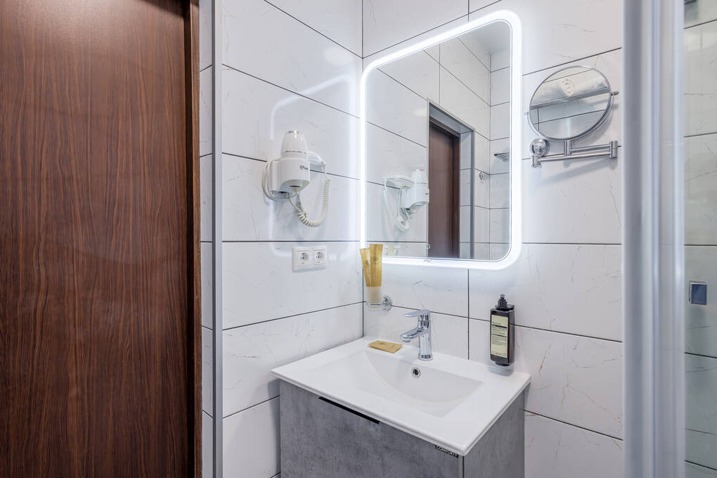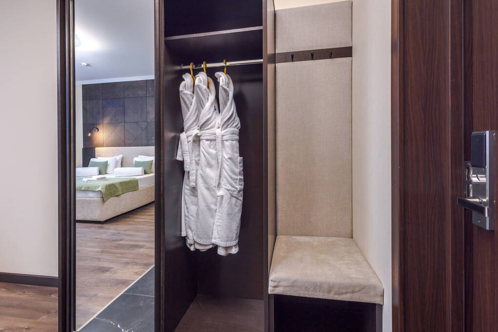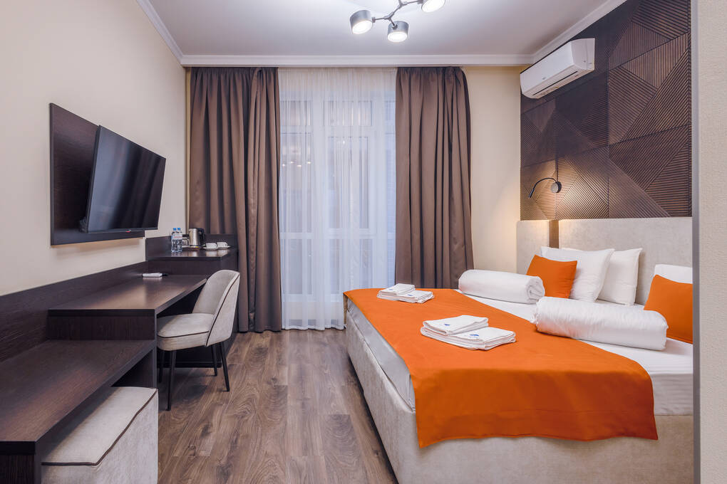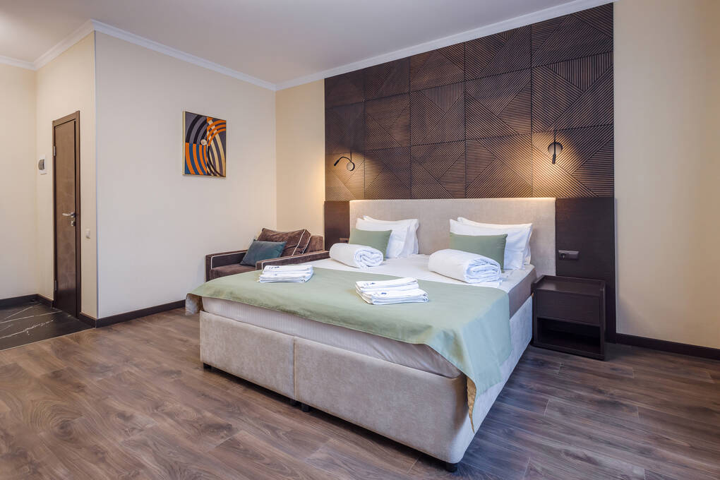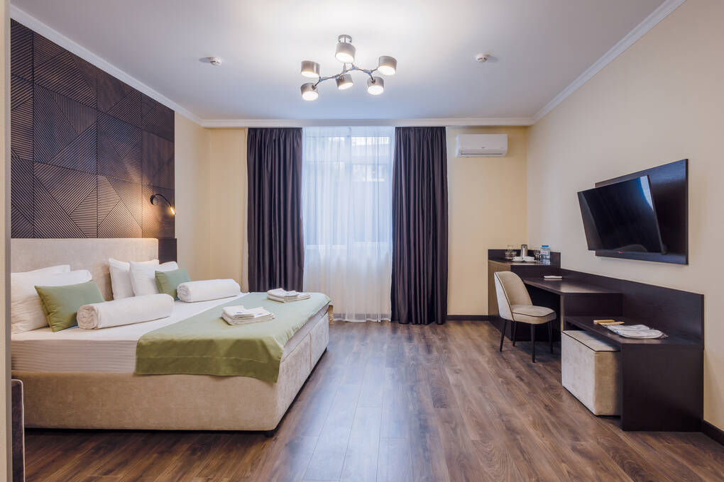 Номера оборудованы всем необходимым: от удобных кроватей, сплит-системы, мини-холодильника и современного телевидения до сейфа и электрического чайника. В гостевом доме предусмотрены полностью оборудованные санузлы с душевыми кабинами и фенами, а также удобства для отдыха: мягкие полотенца, халаты и тапочки.