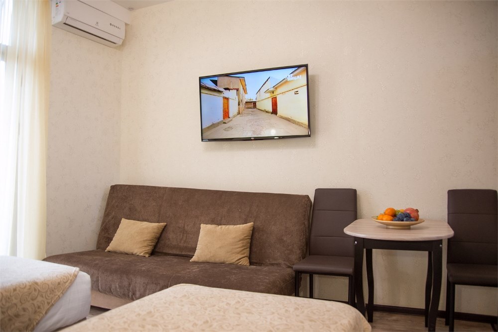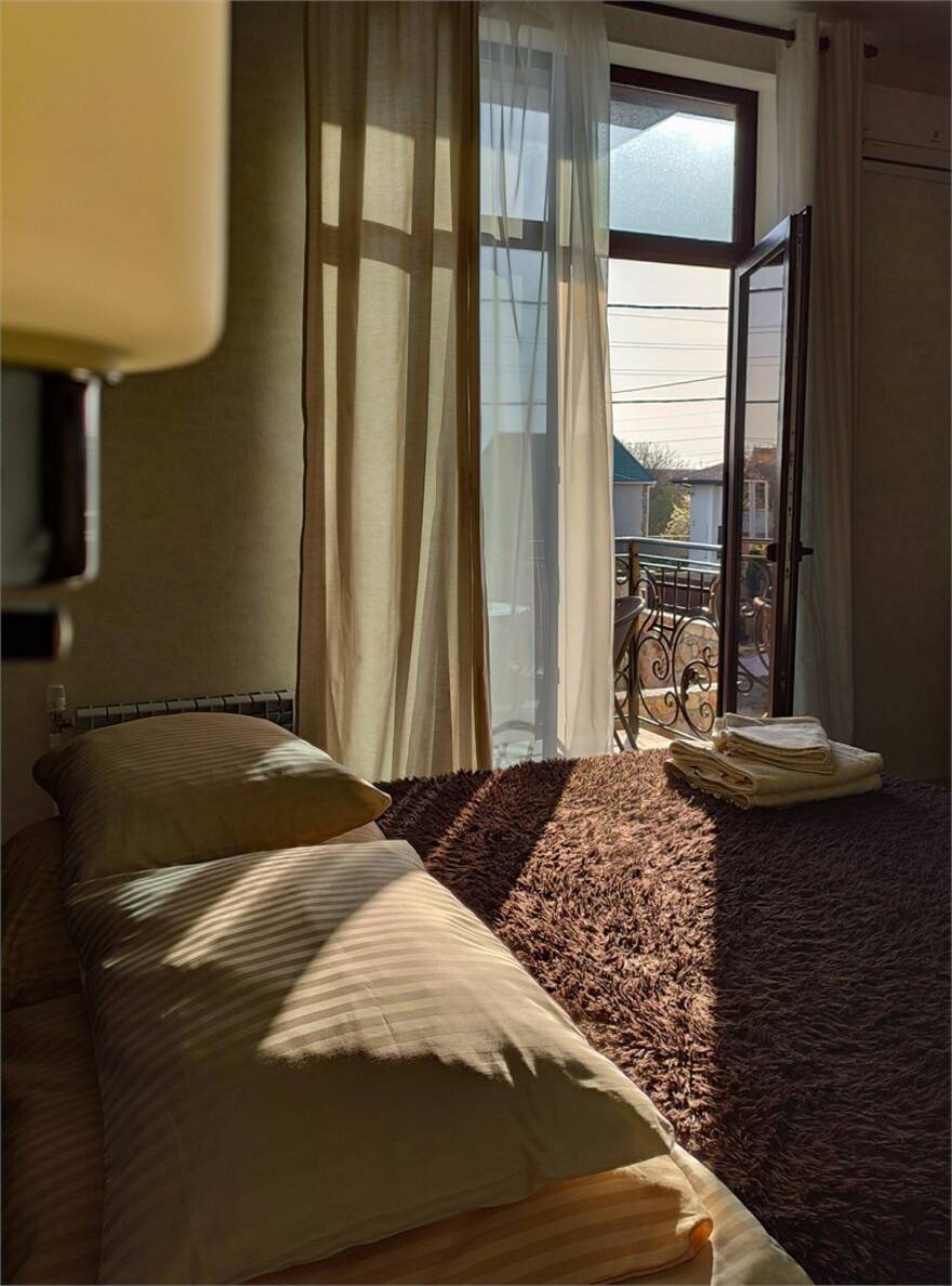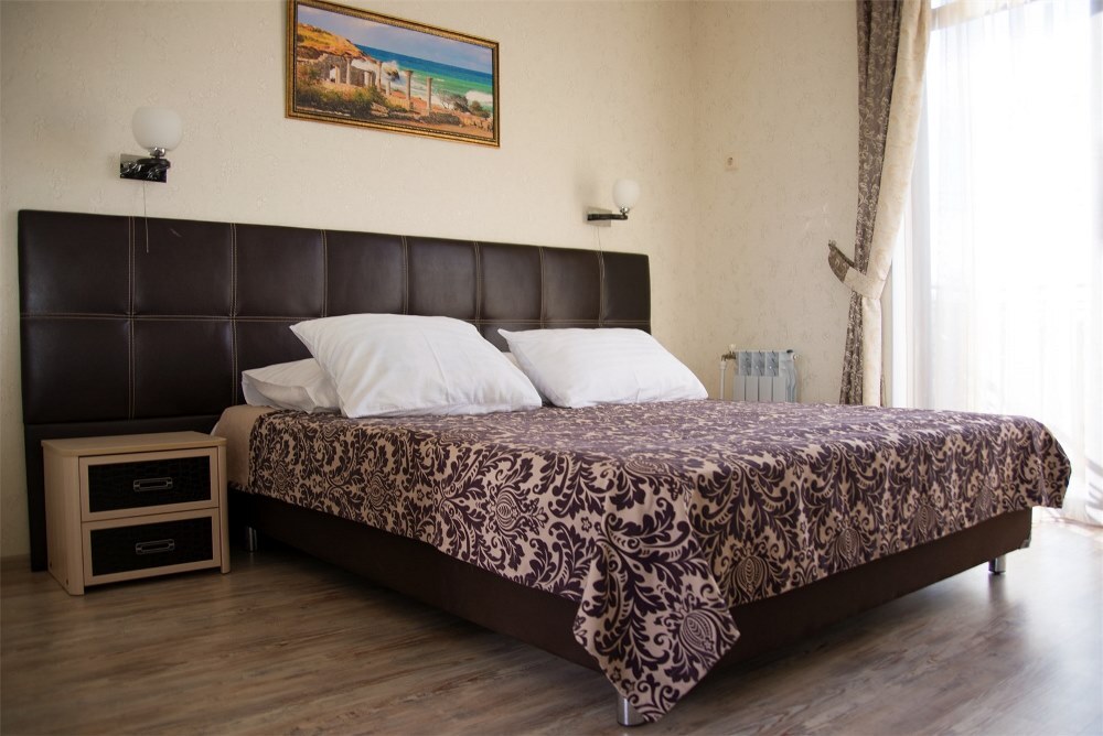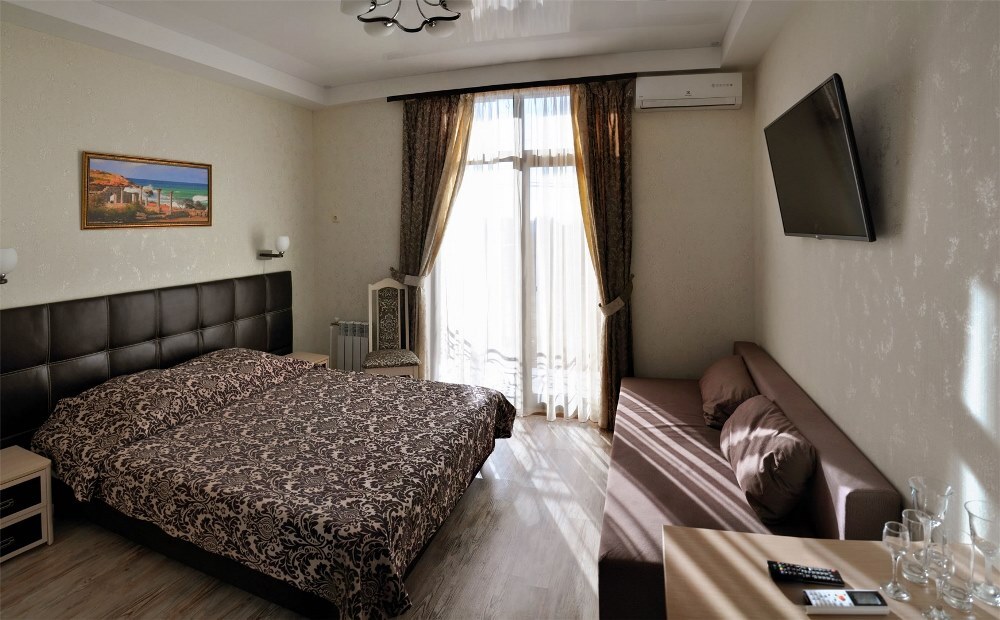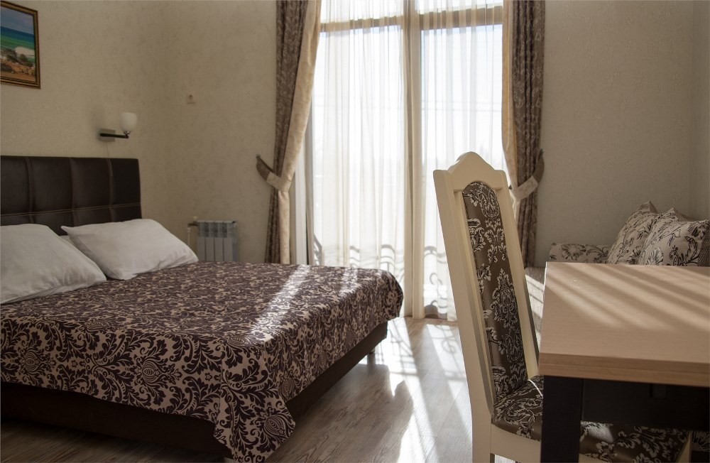 Двухэтажный корпус занимает благоустроенную территорию рядом с морем и парком из хвойных деревьев. В распоряжении гостей однокомнатные и двухкомнатные номера со светлыми интерьерами. В номерах — панорамные окна, есть санузел с душем, кондиционер, мини-холодильник и электрочайник. В некоторых номерах предусмотрены балконы, в других же имеются открытые террасы для отдыха.