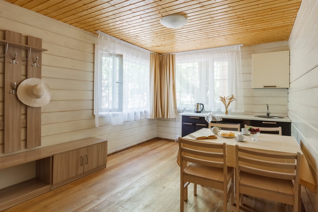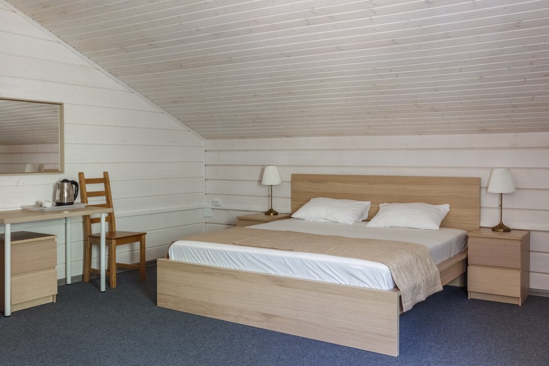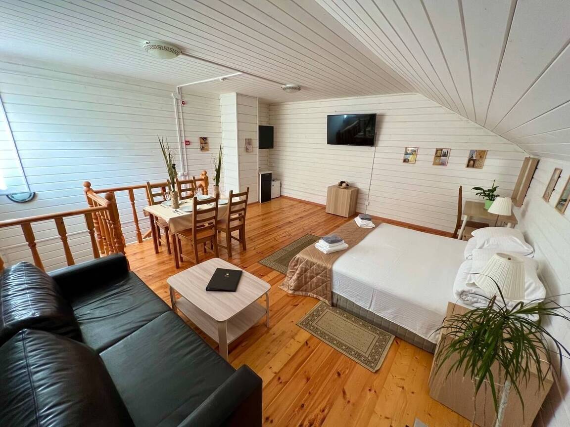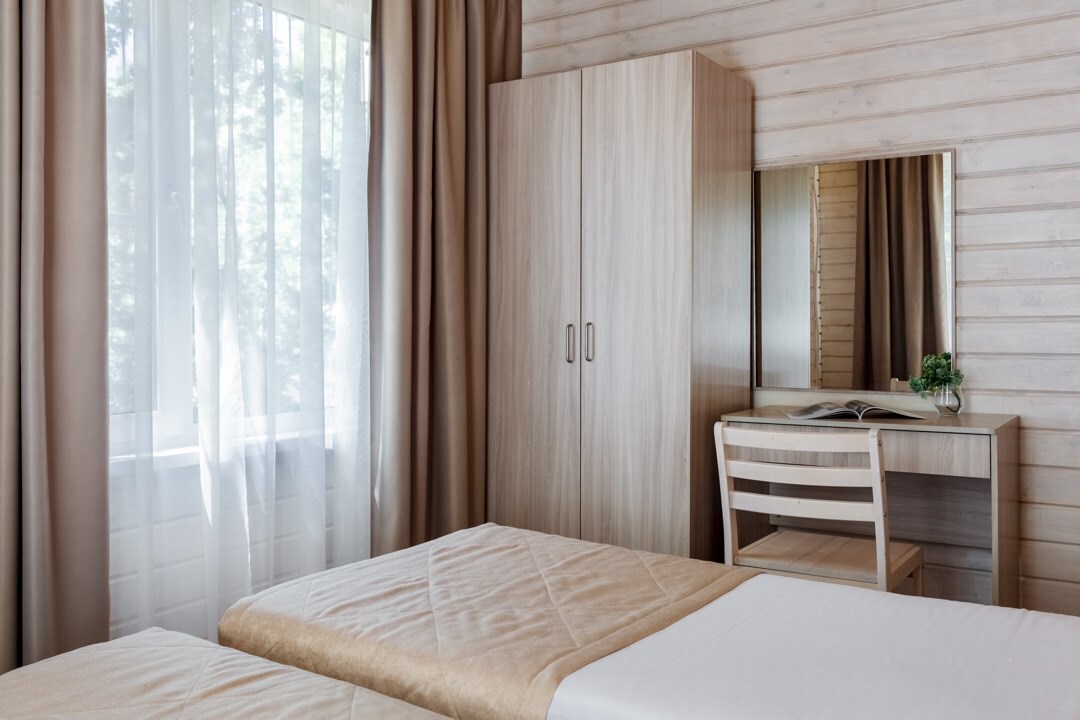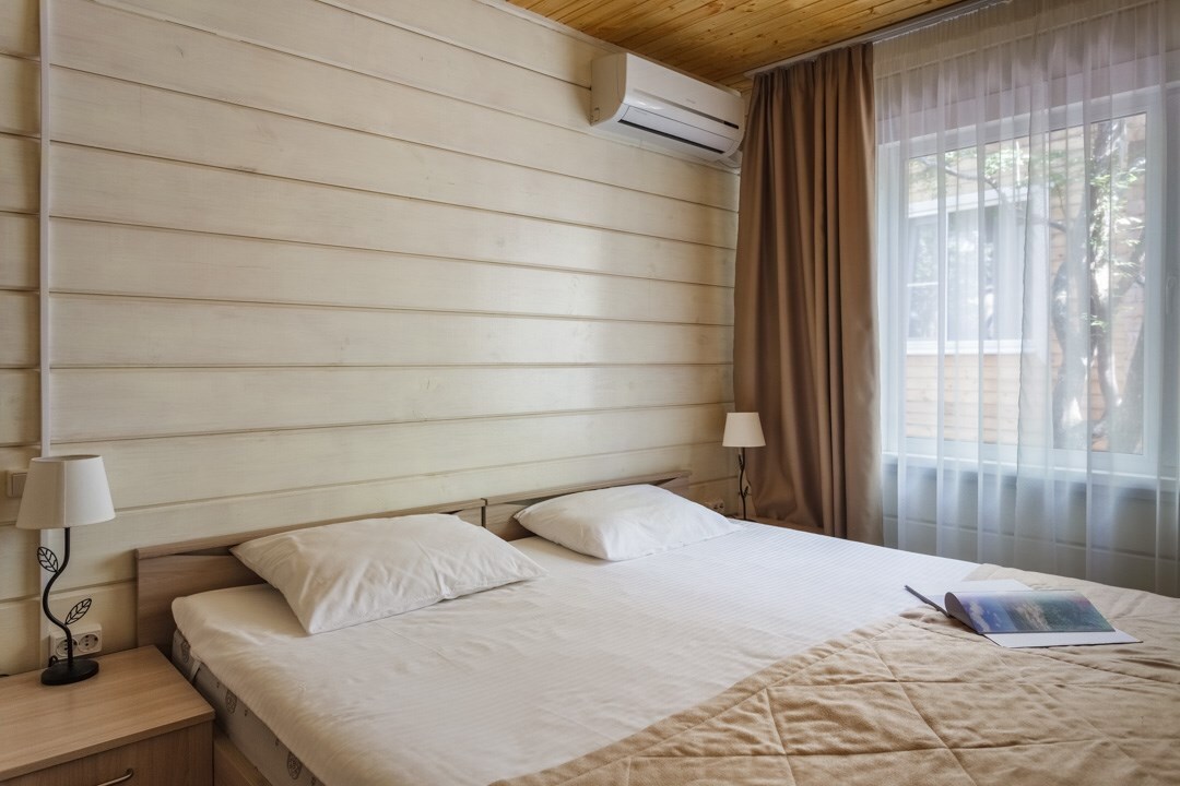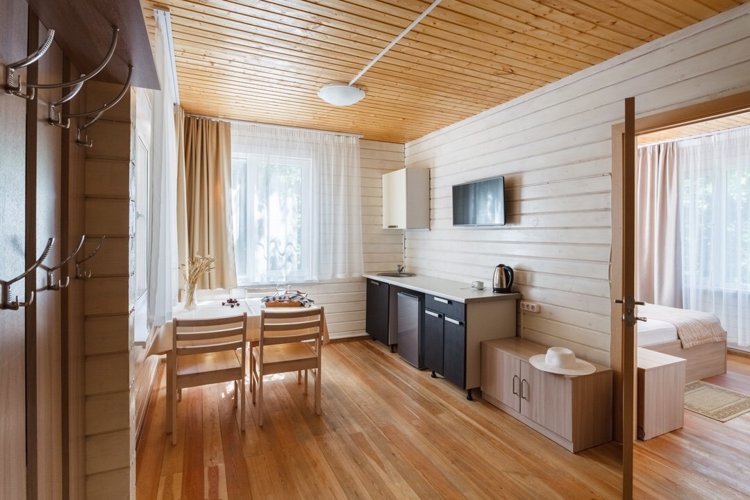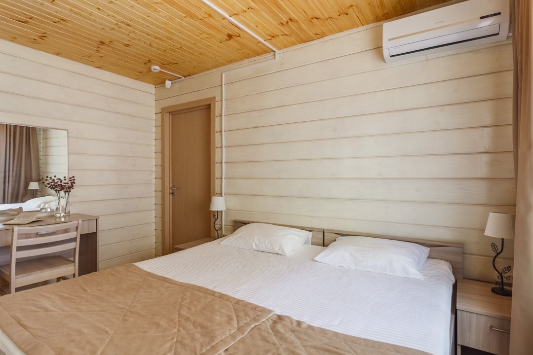 На благоустроенной территории площадью 8 гектаров разместилось несколько двухэтажных корпусов. Гости могут выбрать размещение в номерах категории Студио, Стандарт или заселиться в просторные Апартаменты. В светлых и уютных номерах есть все для комфортного отдыха — современная мебель, бытовая техника, собственный санузел.