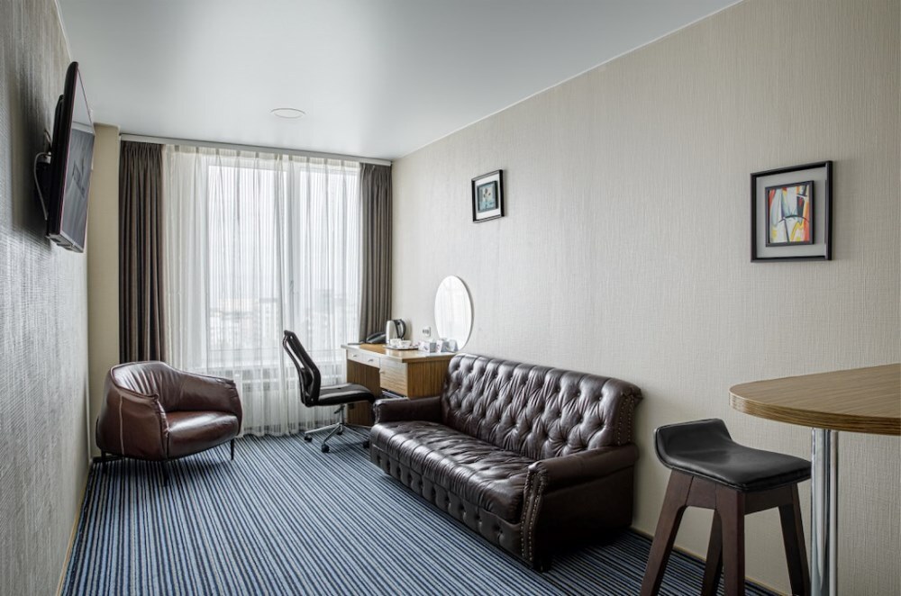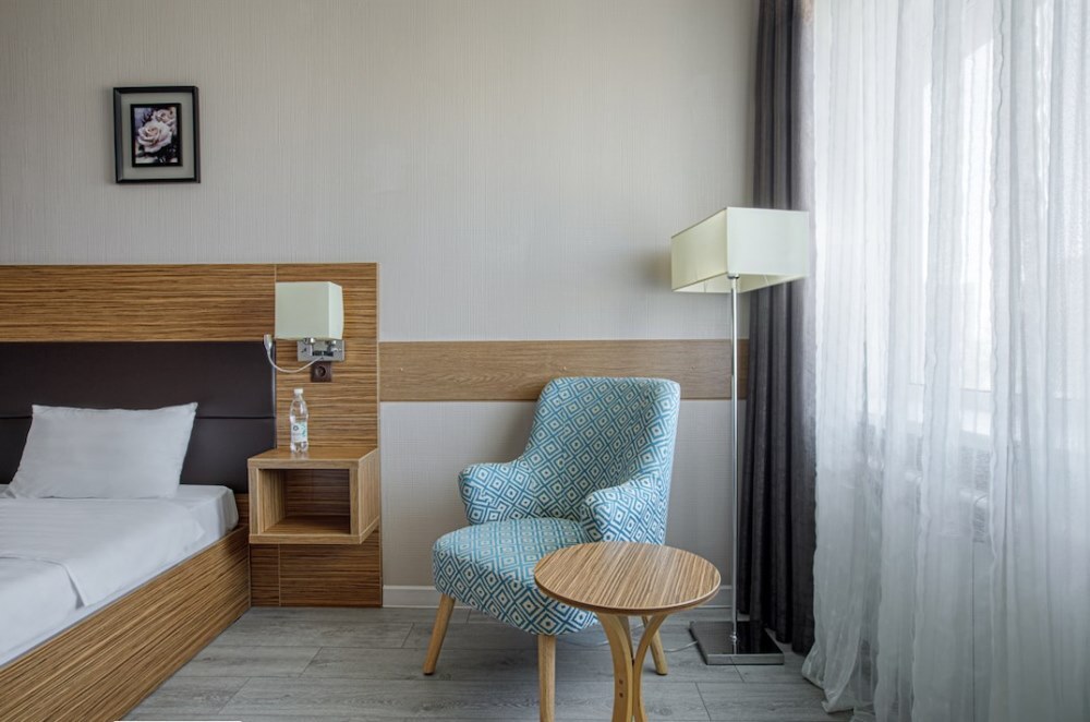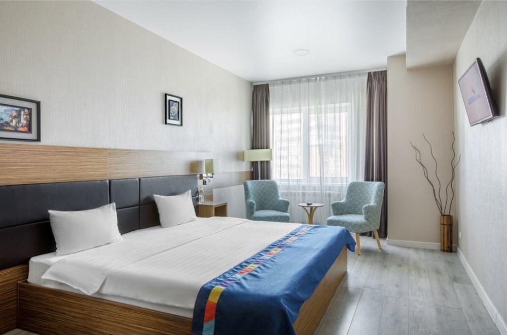 Восьмиэтажное здание отеля, оснащенное лифтом, находится на одной из главных магистралей района — улице Партизанской. Гостей ожидают комфортабельные номера категории Стандарт, Супериор, Люкс. Номера небольшие, но хорошо меблированы, со стильным интерьером. В каждом есть собственный санузел с душевой или ванной, бытовая техника — телевизор, кондиционер, электрочайник, доступен беспроводной интернет.