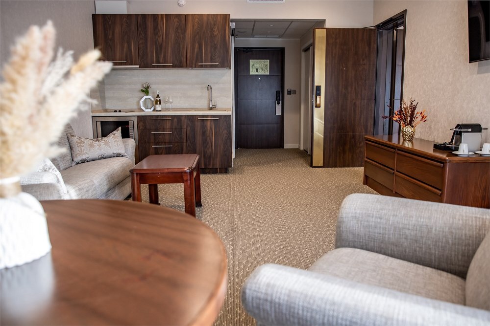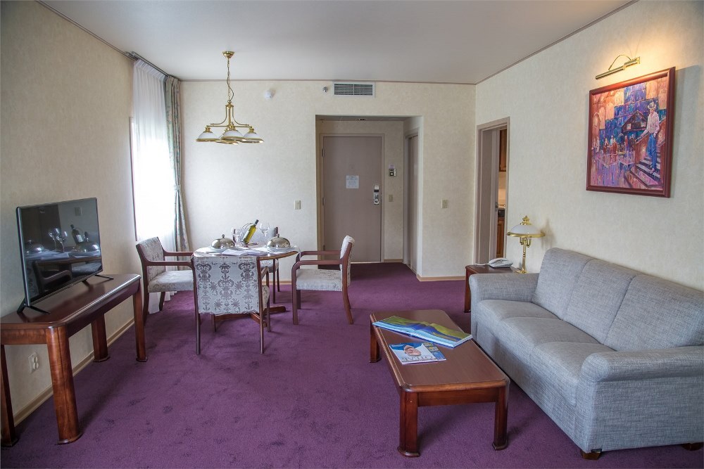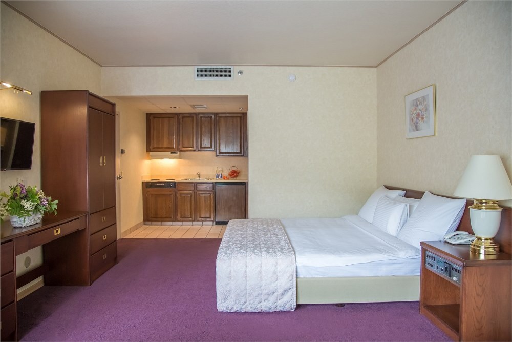 Современный корпус отеля занимает зеленую благоустроенную территорию среди зеленого леса. Жилой фонд, рассчитанный на 140 человек, предлагает отдыхающим комфортабельные светлые номера. В каждом номере есть телевизор, кондиционер, в ванной комнате гостей ожидают косметические наборы и теплые уютные халаты. Номера улучшенных категорий оснащены мини-кухней, оборудованные бытовой техникой.