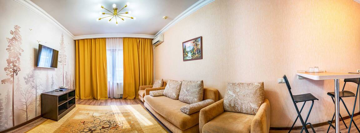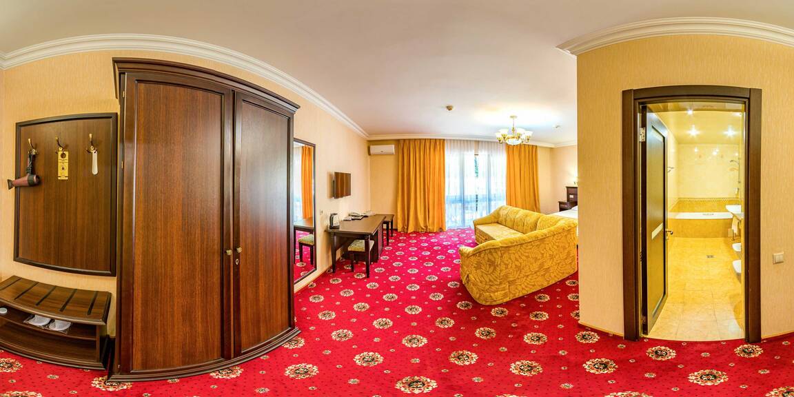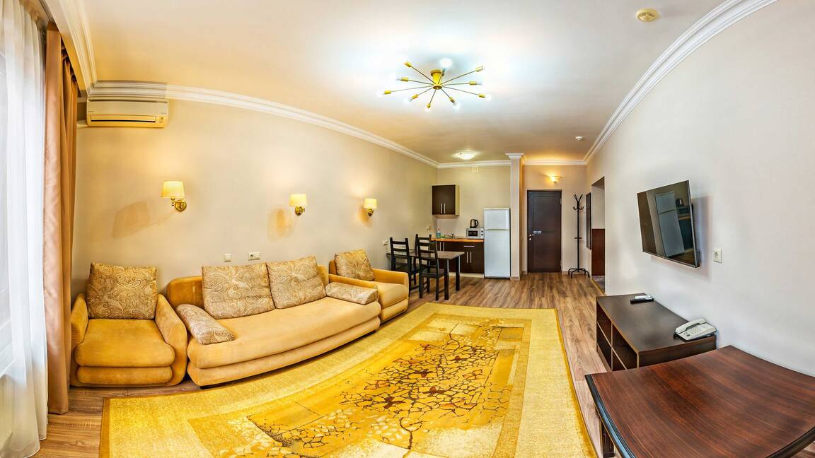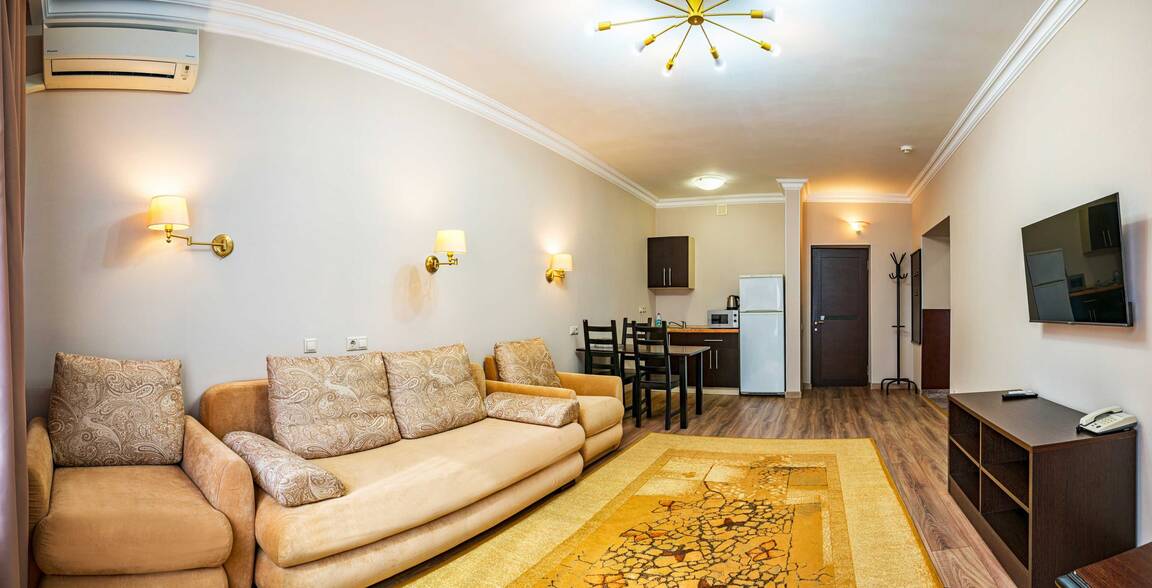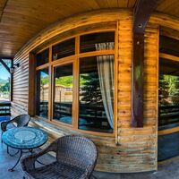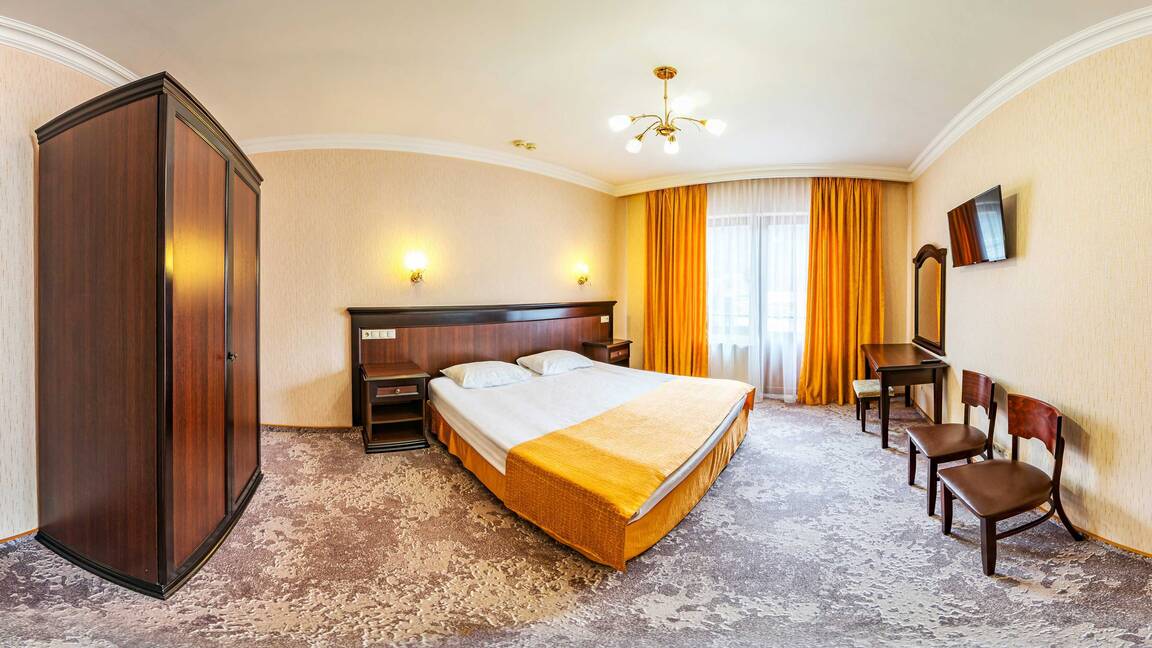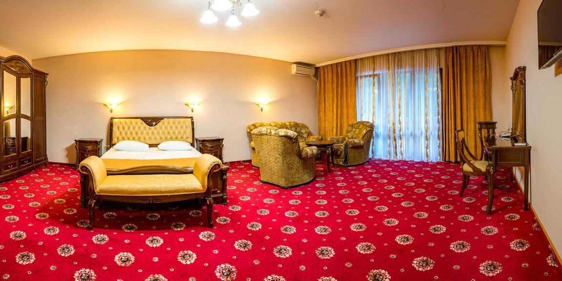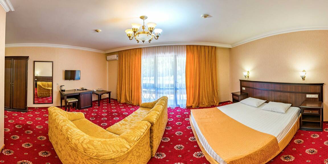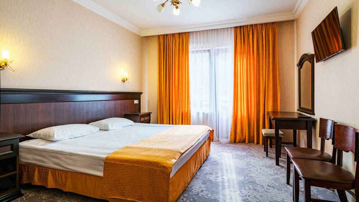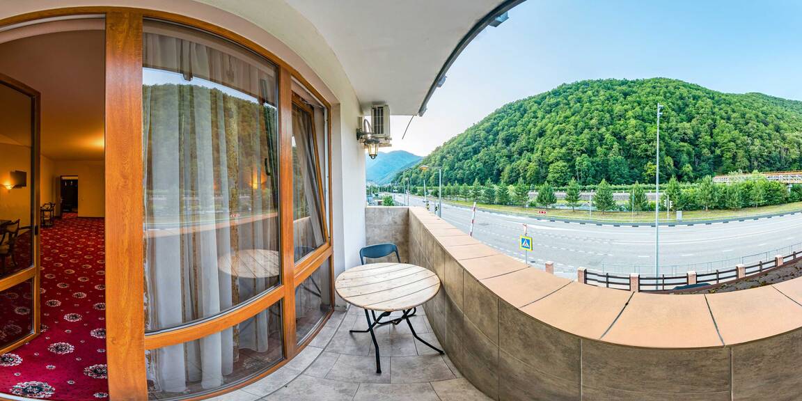 Четырехэтажный корпус отеля, выстроенный в фахверковом альпийском стиле, расположен на берегу реки Мзымта. Гостей ожидают однокомнатные номера Стандарт и двухкомнатные Апартаменты. Номера с выдержанными в теплой пастельной гамме интерьерами, оснащены санузлом с душем, везде предусмотрены балконы. Апартаменты оборудованы мини-кухней.