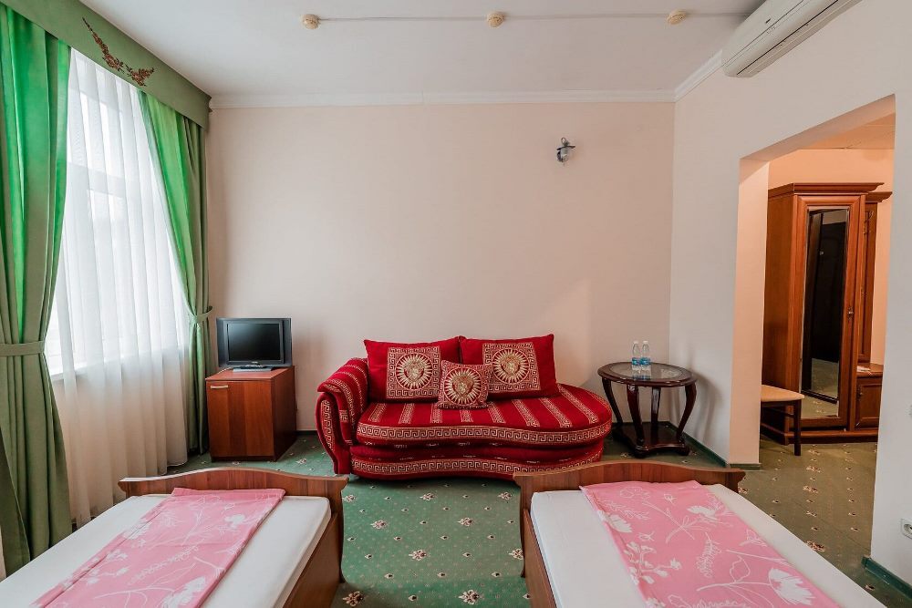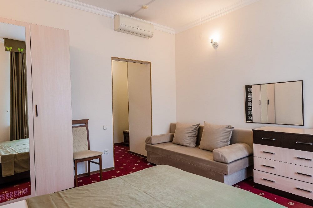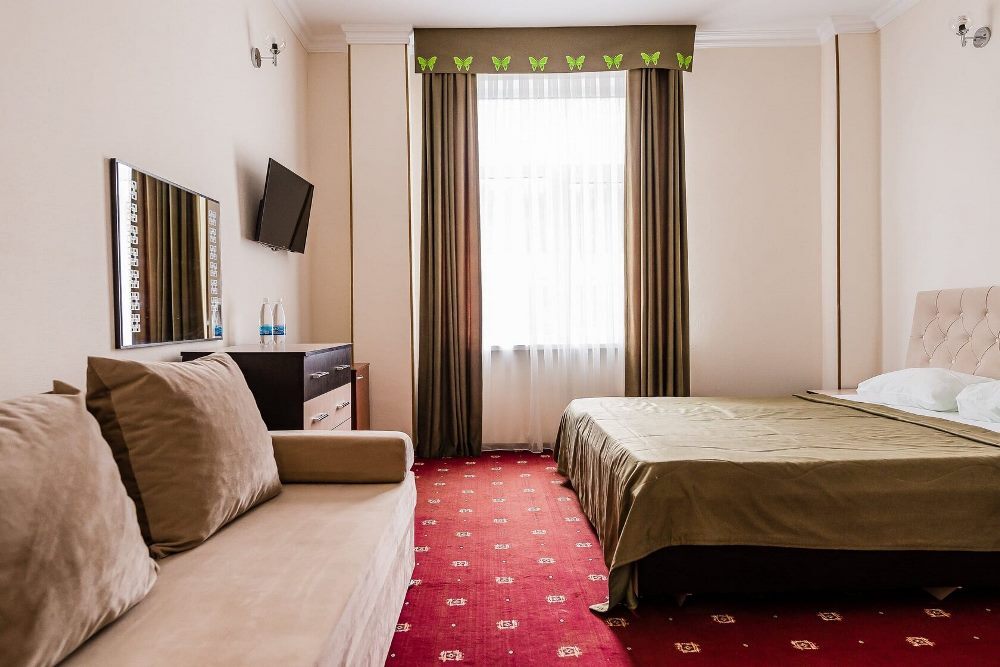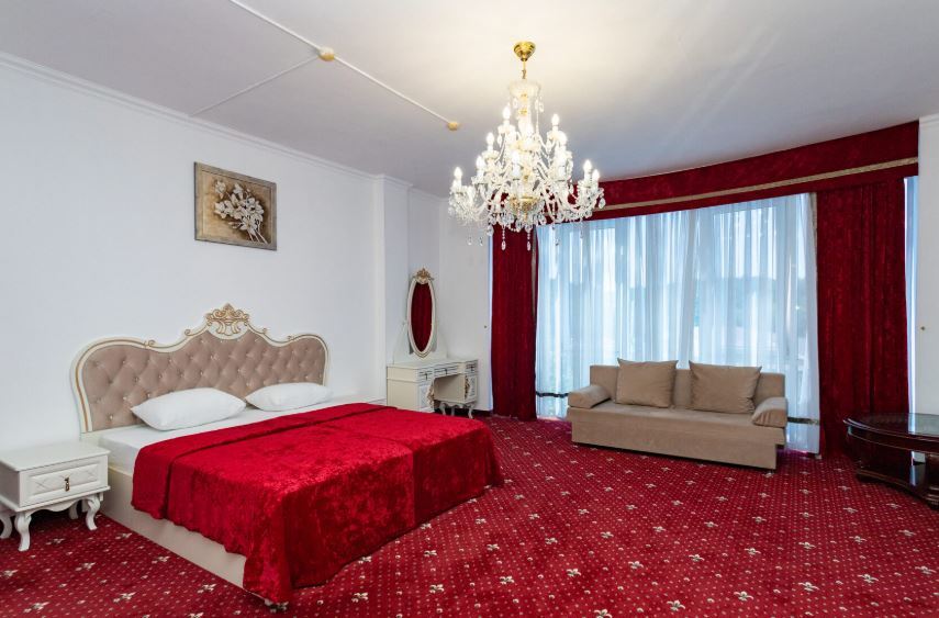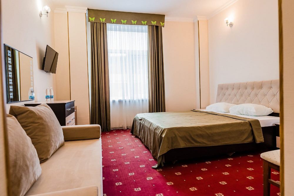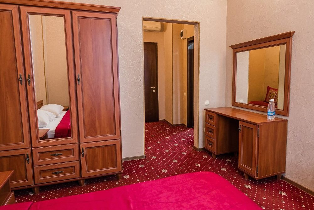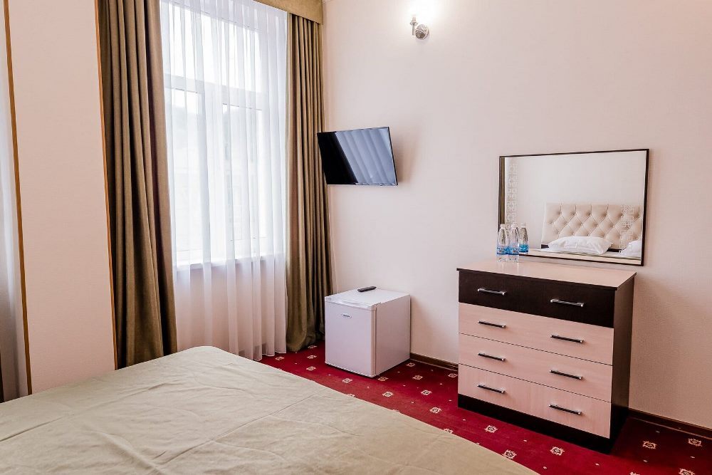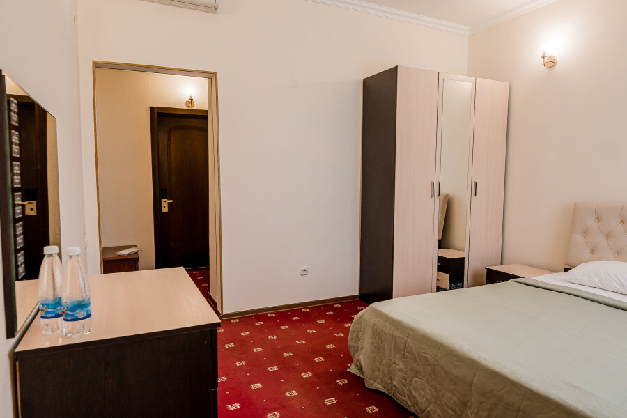 Отель занимает небольшую благоустроенную территорию, жилой фонд включает 90 номеров разной категории комфорта. Номера, выдержанны в классическом стиле, снащены всем необходимым — есть кондиционер, плазменный телевизор. В ванной комнате установлена душевая кабина, для гостей подготовлен набор косметических принадлежностей.