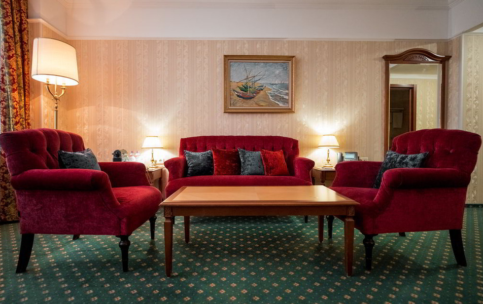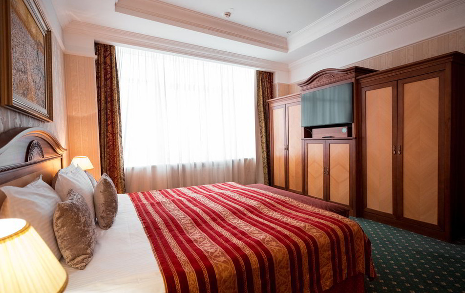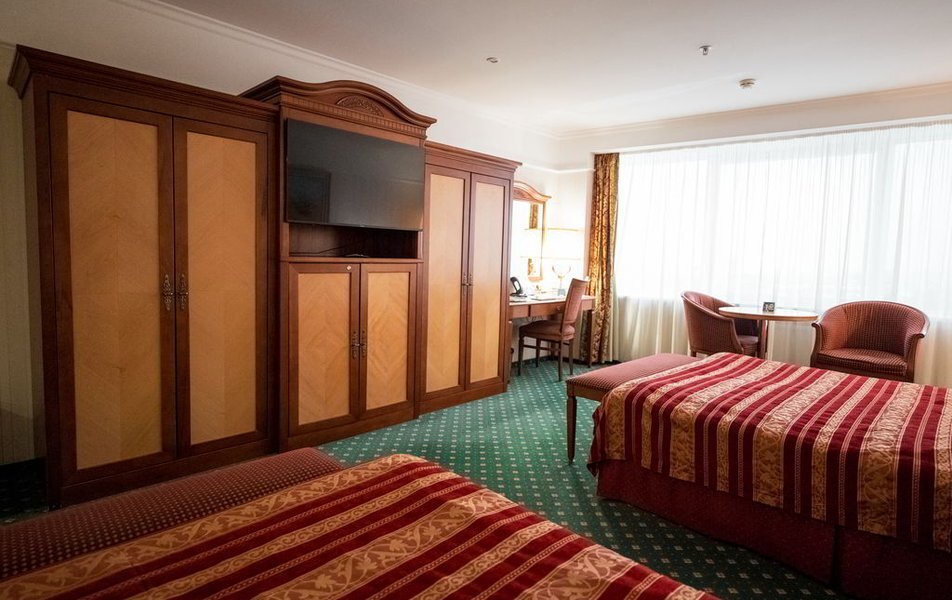 Доминанта комплекса – 12-ти этажное здание оборудовано лифтами и включает в себя 202 номера высшей категории комфорта. Номера, оформленные в классическом стиле, укомплектованы современной техникой – ЖК-телевизором кондиционером, феном, в санузле, оснащенном ванной и биде, для гостей приготовлены косметические принадлежности, тапочки, халат.