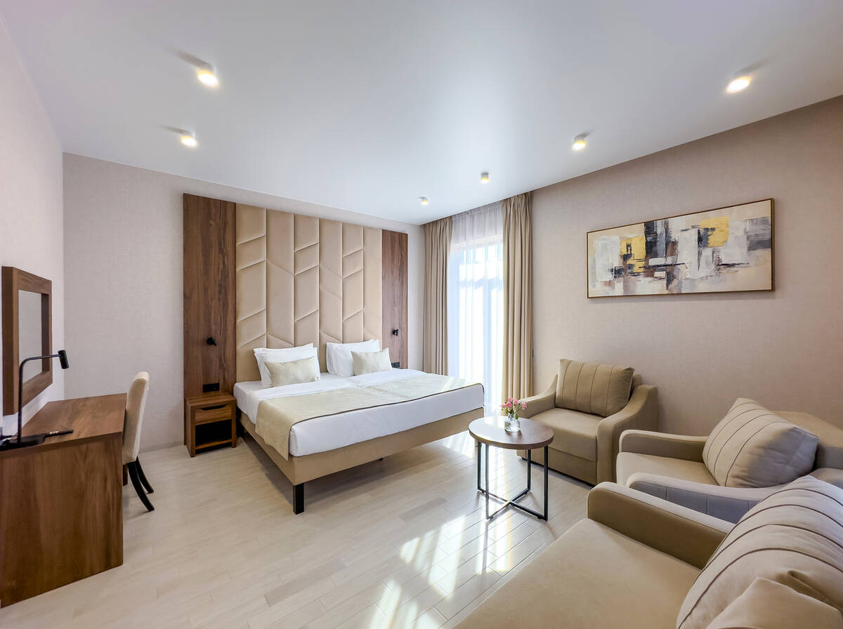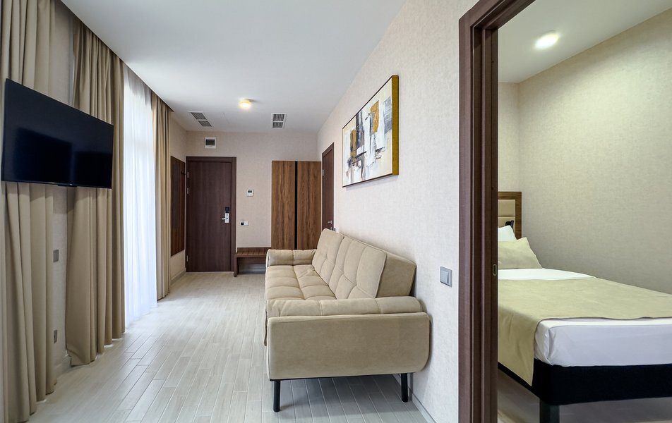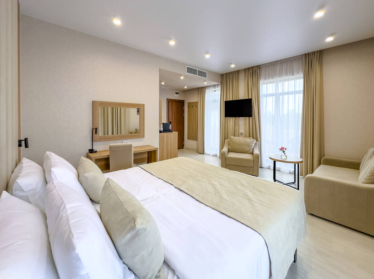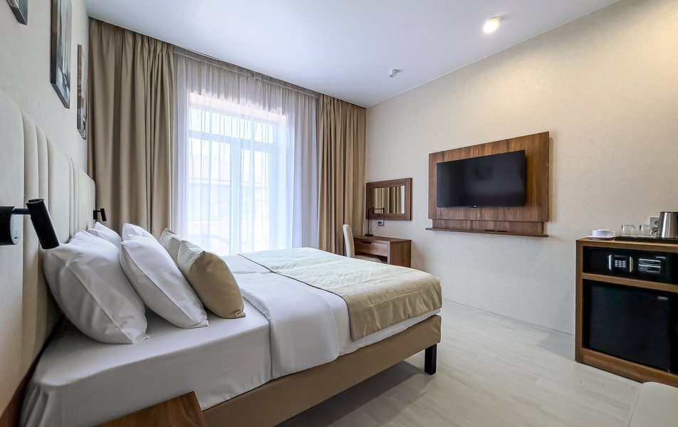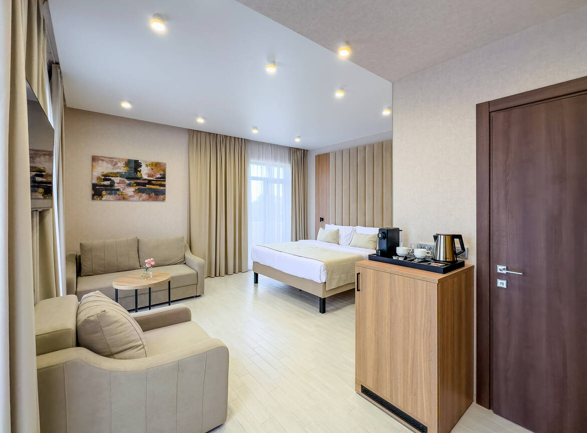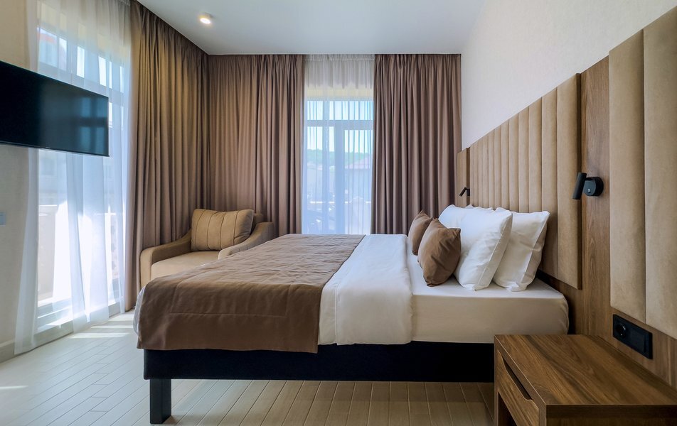 Для размещения гостей предусмотрены номера разных категорий, включая стандартные, улучшенные, люксы и апартаменты. Интерьеры оформлены в теплой гамме с использованием натуральных материалов и мягкого освещения. В каждом номере установлены кровати, шкафы для одежды, телевизоры, кондиционеры, мини-холодильники, электрочайники и душевые комнаты.