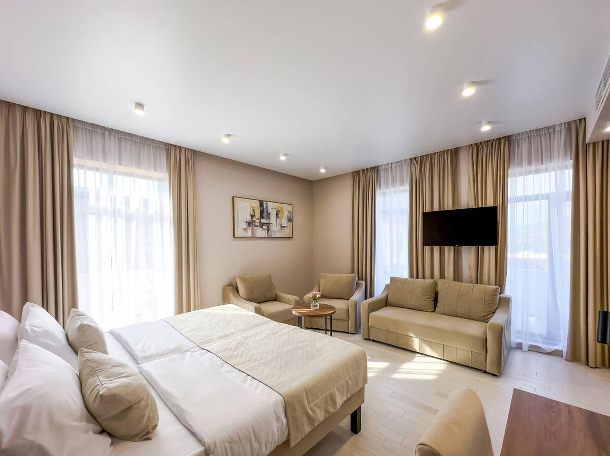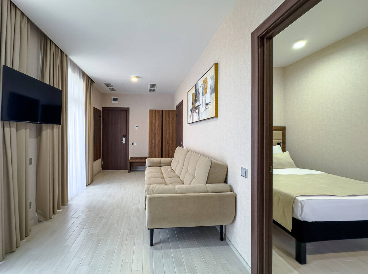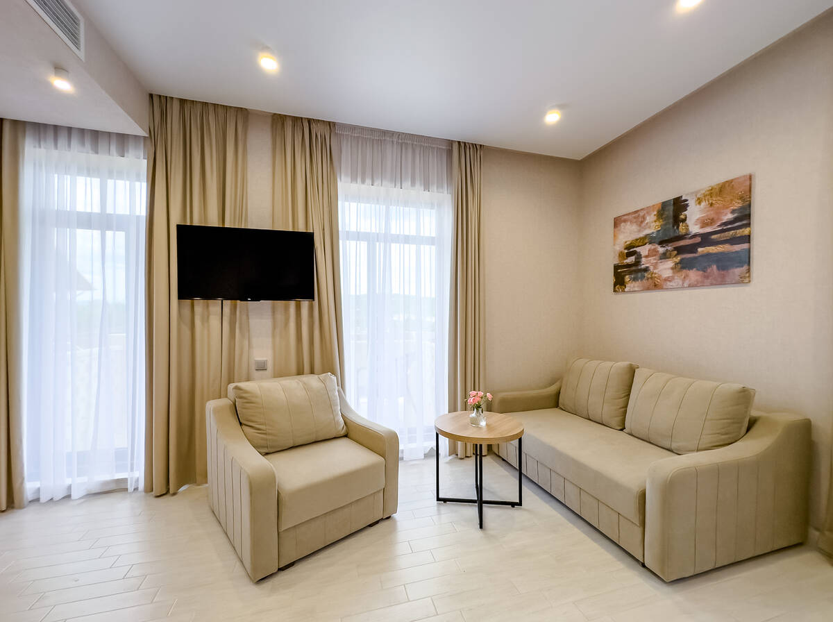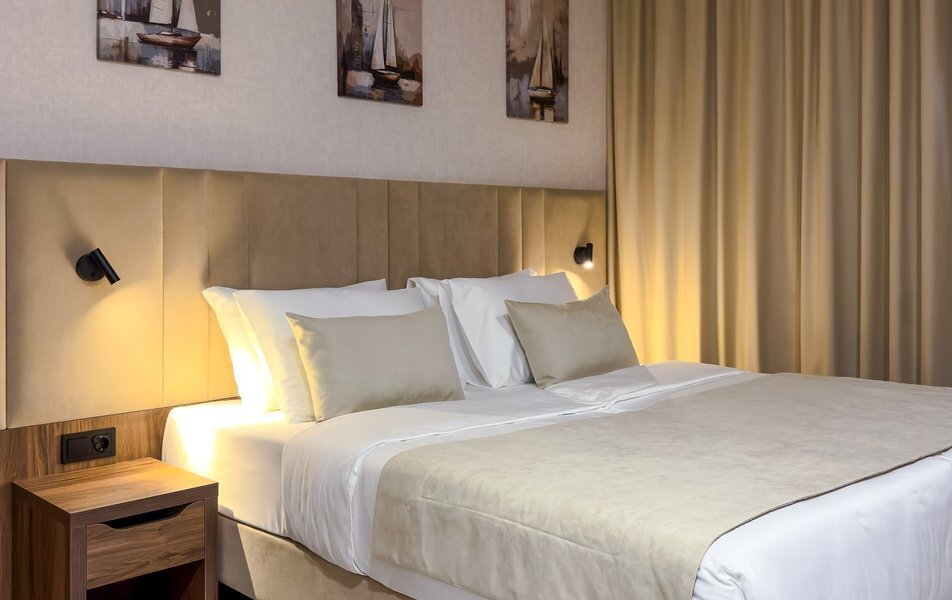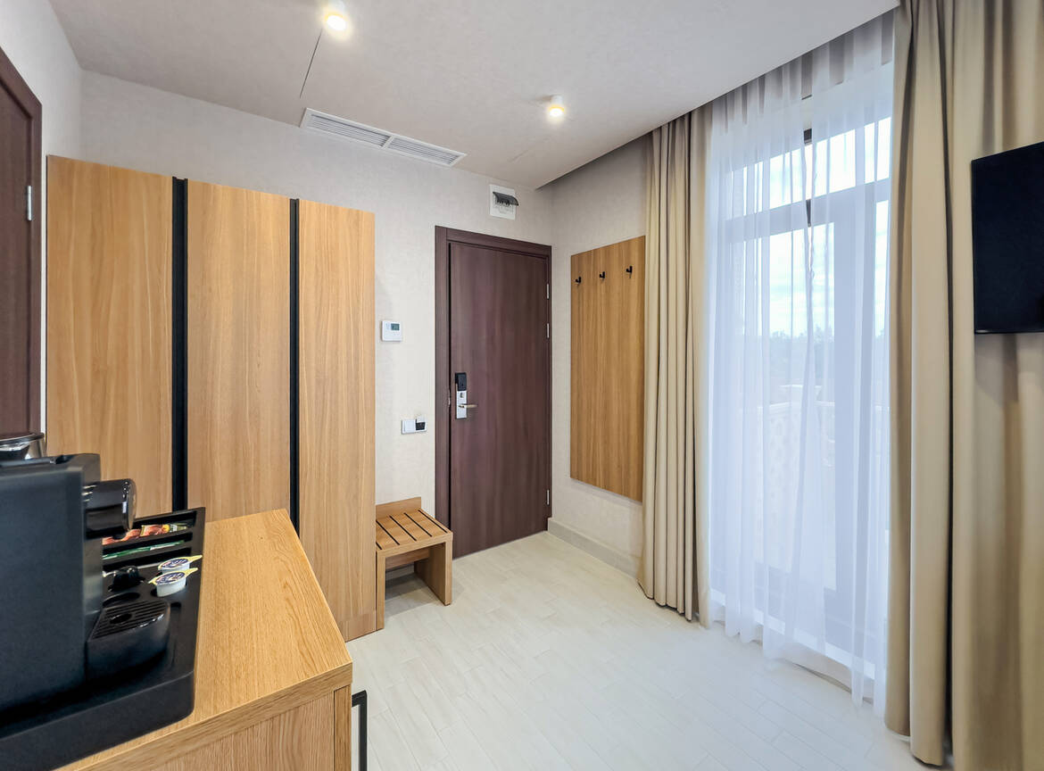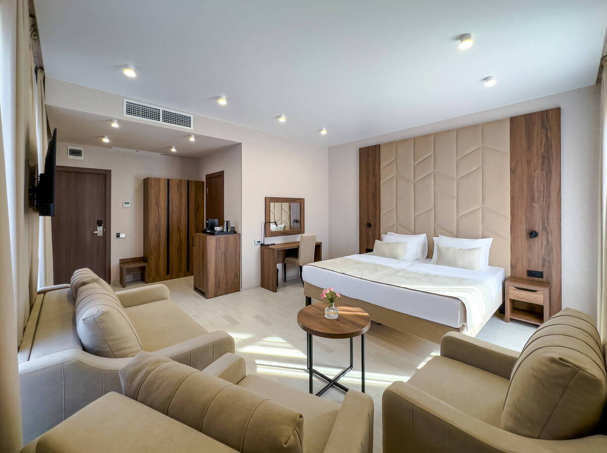 Для размещения гостей предусмотрены номера разных категорий, включая стандартные, улучшенные, люксы и апартаменты. Интерьеры оформлены в теплой гамме с использованием натуральных материалов и мягкого освещения. В каждом номере установлены кровати, шкафы для одежды, телевизоры, кондиционеры, мини-холодильники, электрочайники и душевые комнаты.