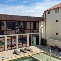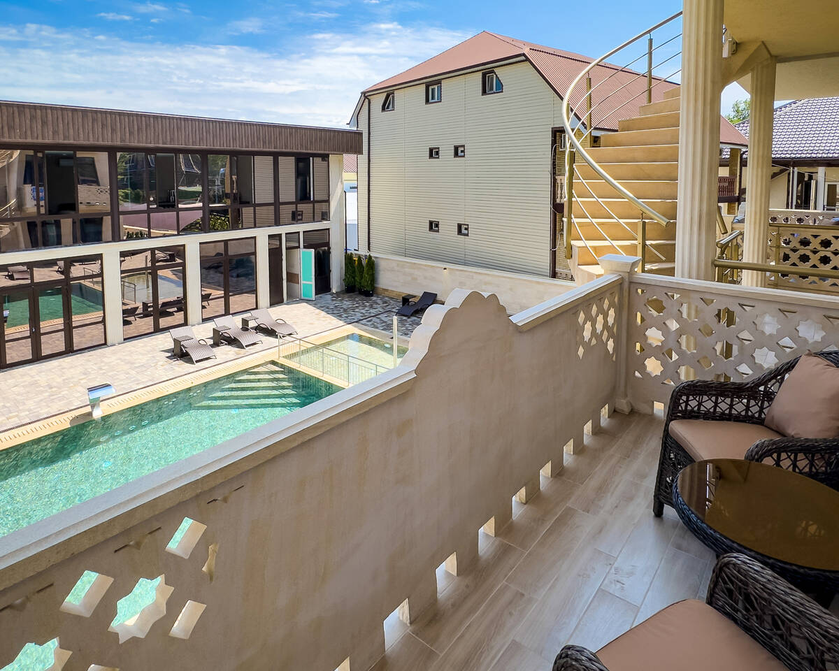 На благоустроенной территории оборудованы открытый бассейн с гидромассажем для взрослых и отдельная детская зона с навесом, шезлонги для отдыха, а также площадки для прогулок.