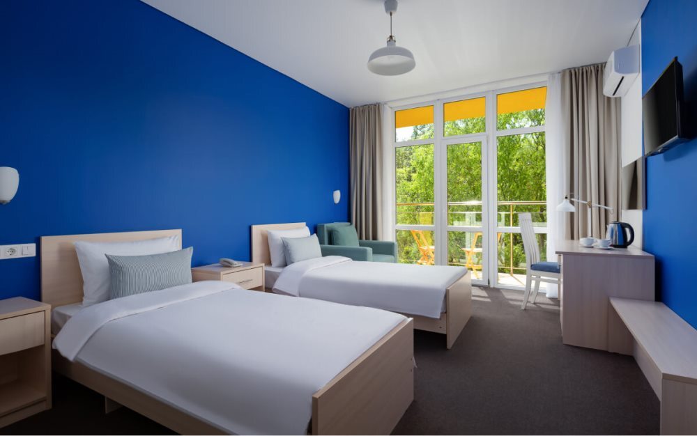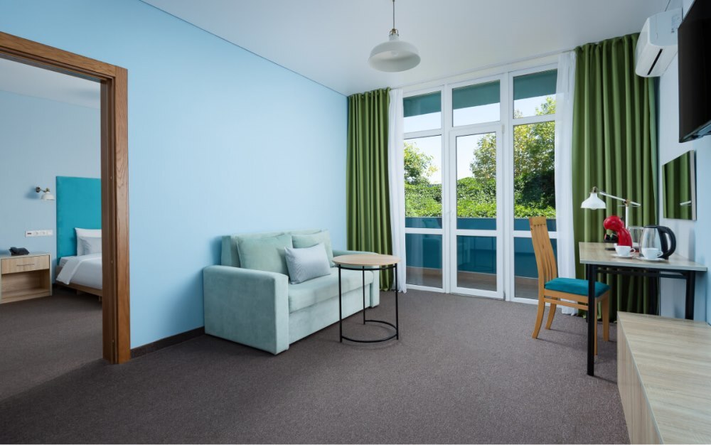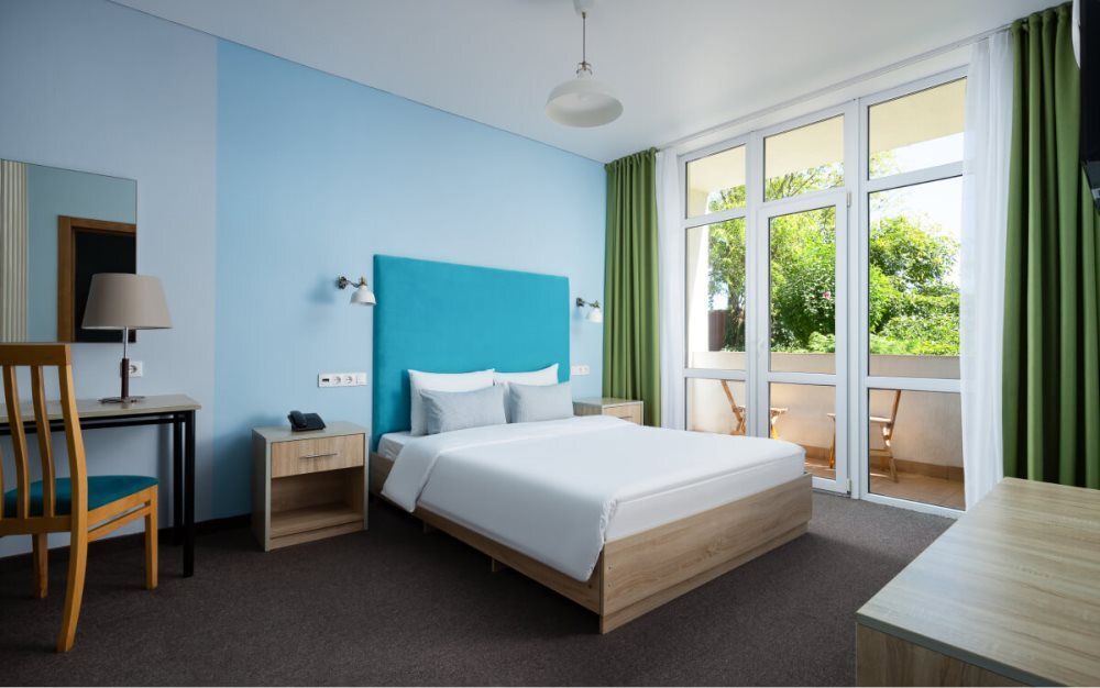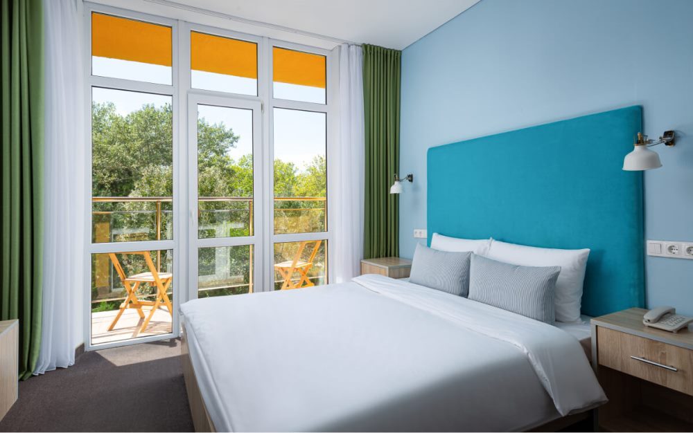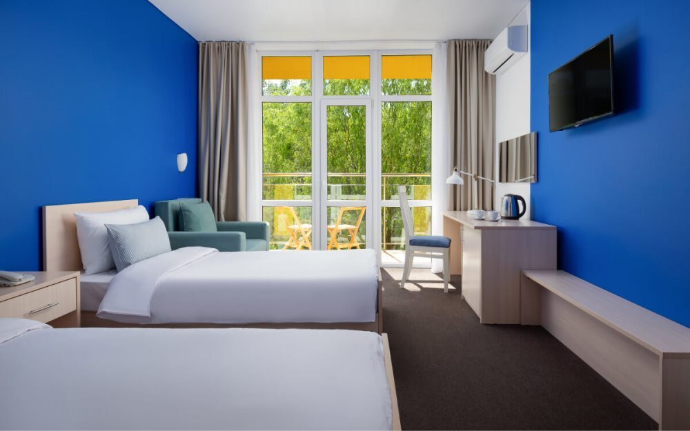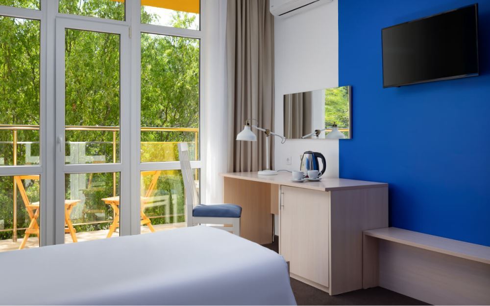 Отель оформлен в ярком современном стиле, на территории находятся 2 корпуса – «Море» и «Лето». Питание организовано по системе «шведский стол» и мы готовы удовлетворить гастрономические потребности каждого. Для детей у нас предусмотрены несколько видов блюд , приготовленных на пару, без добавления масла.