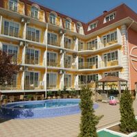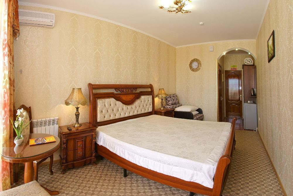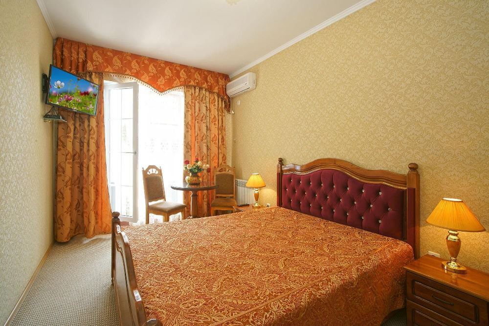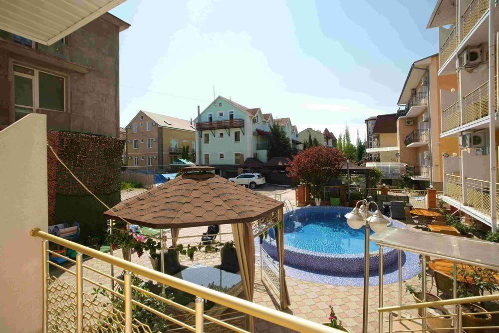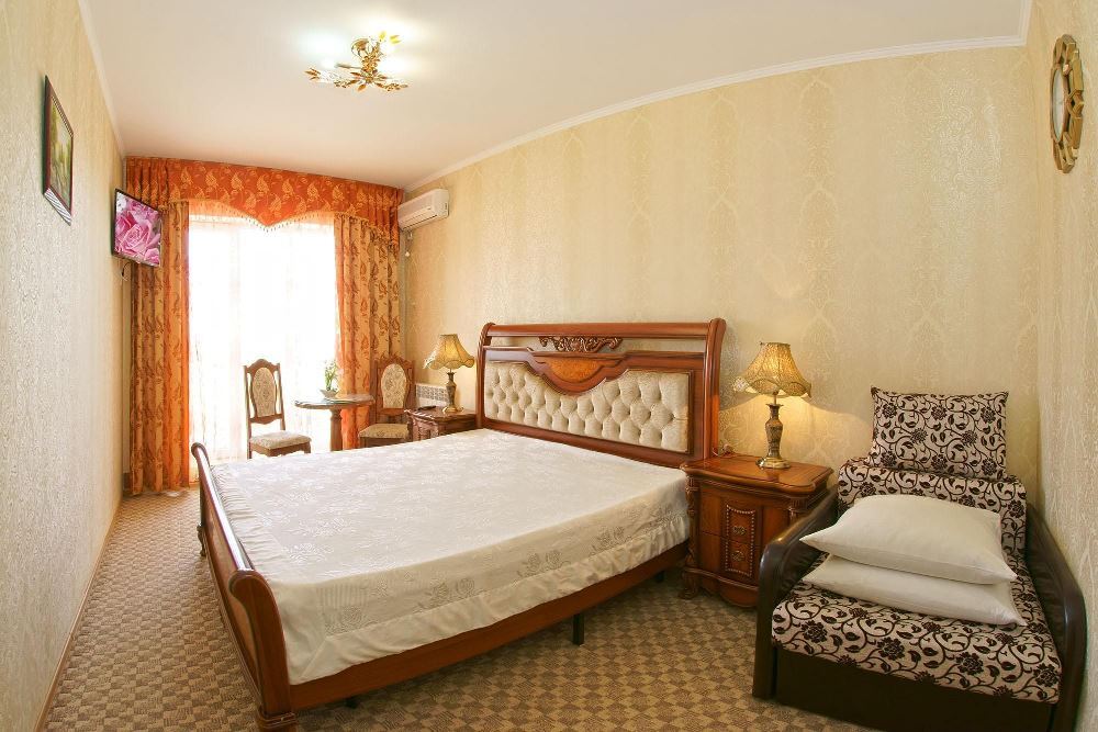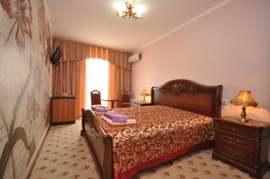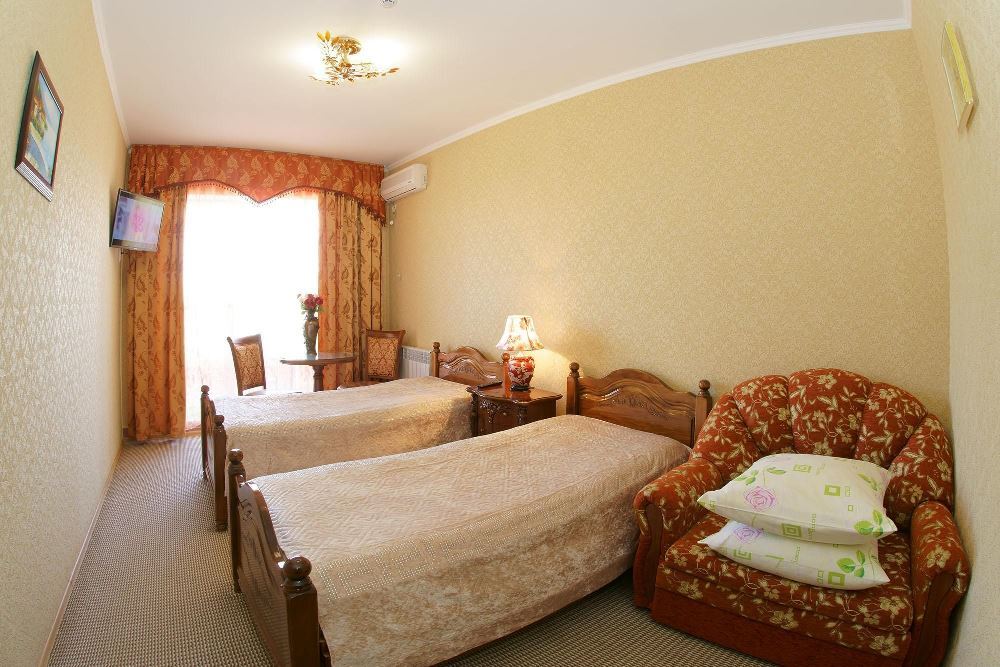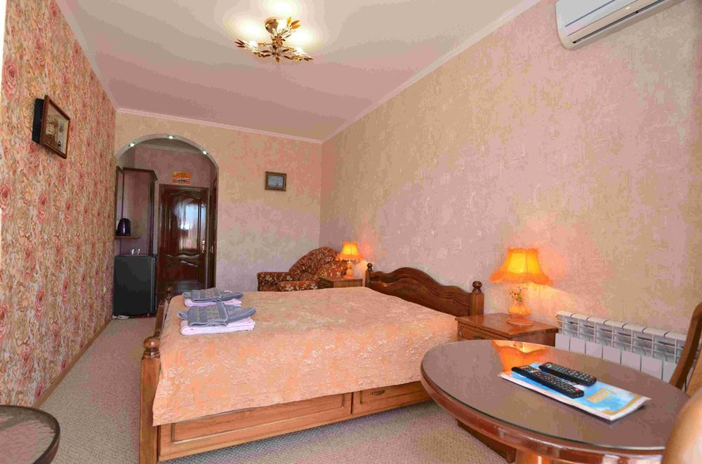 Четырехэтажный корпус отеля занимает небольшую закрытую территорию в 600 метрах от моря. Просторный жилой фонд предлагает однокомнатные и двухкомнатные номера со всеми удобствами. В каждом номере предусмотрен санузел с душем, есть кондиционер, отлично справляющийся с крымской жарой, телевизор и холодильник.