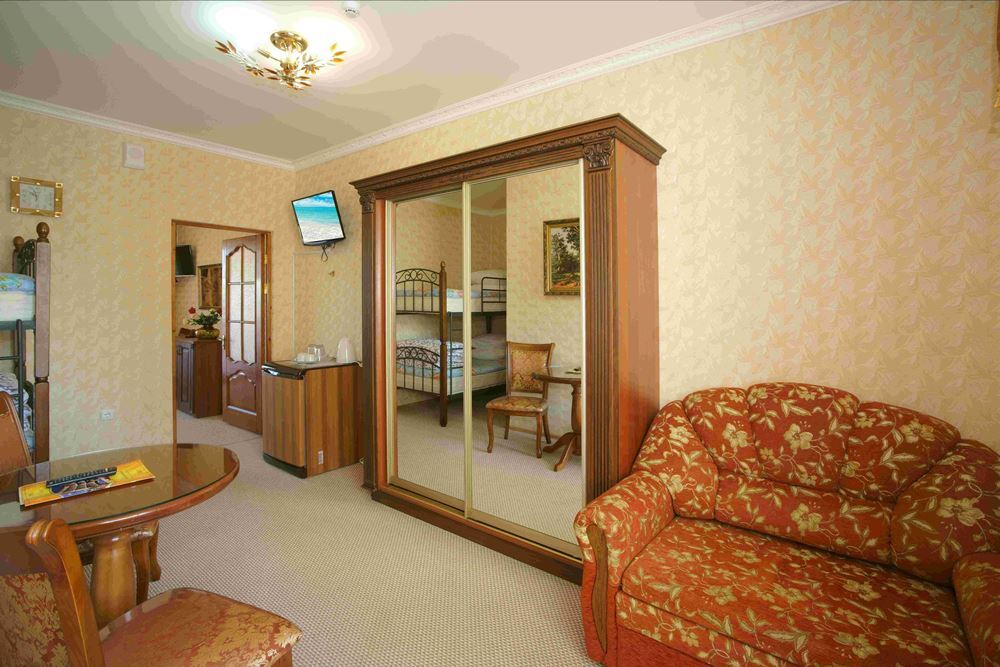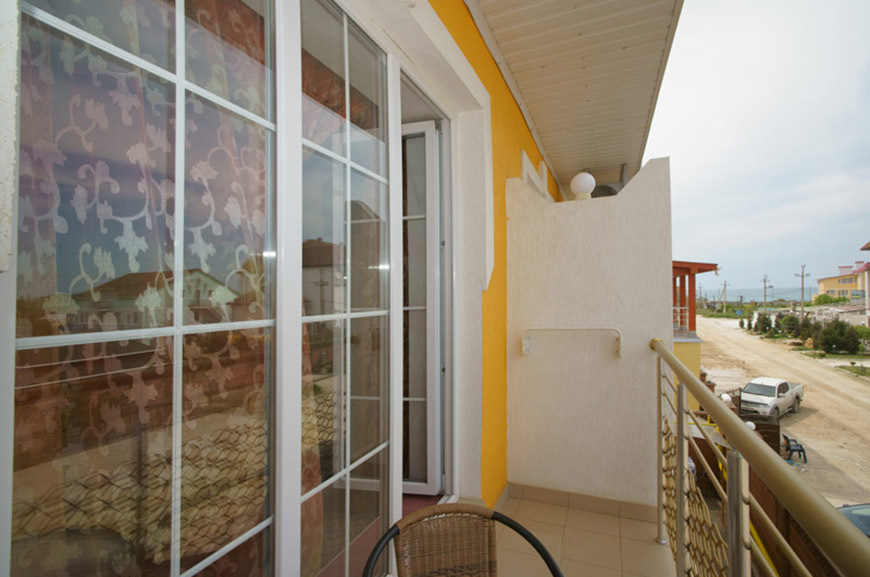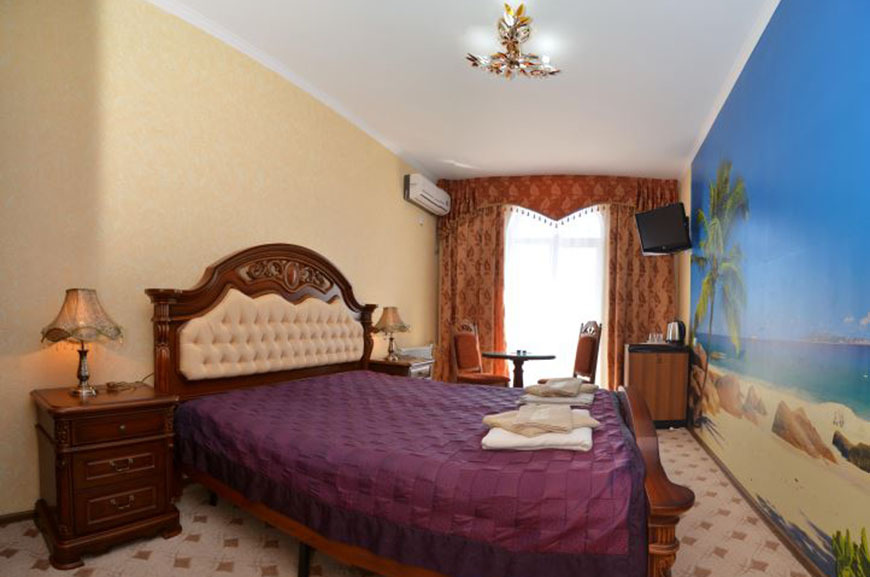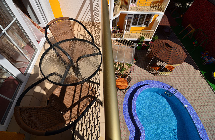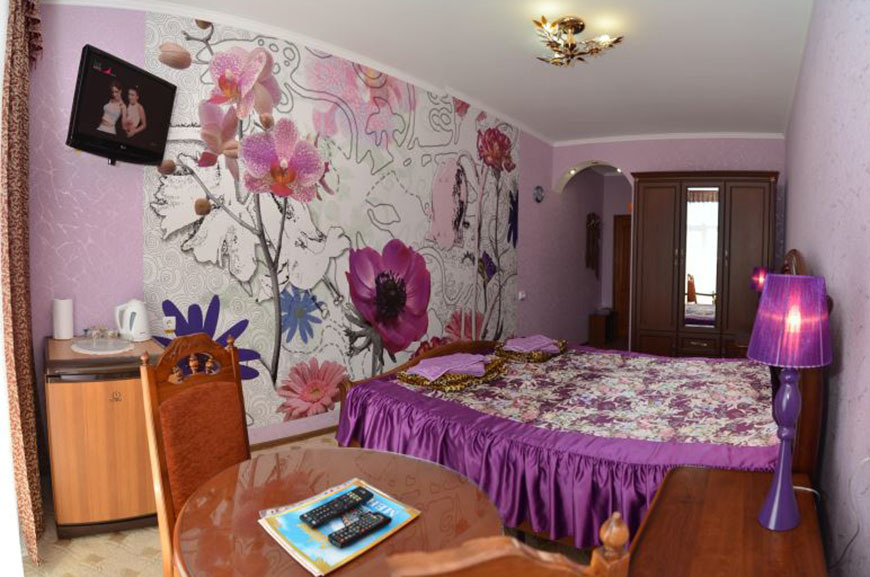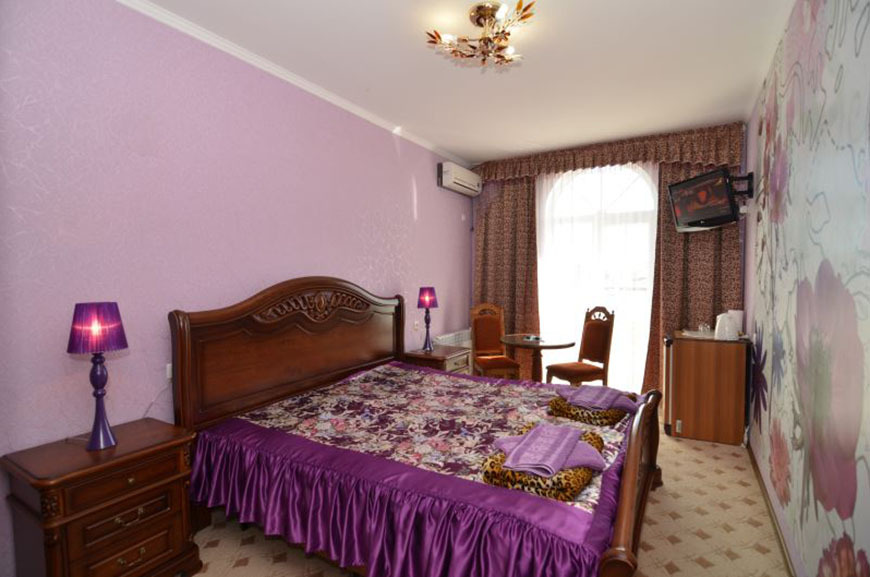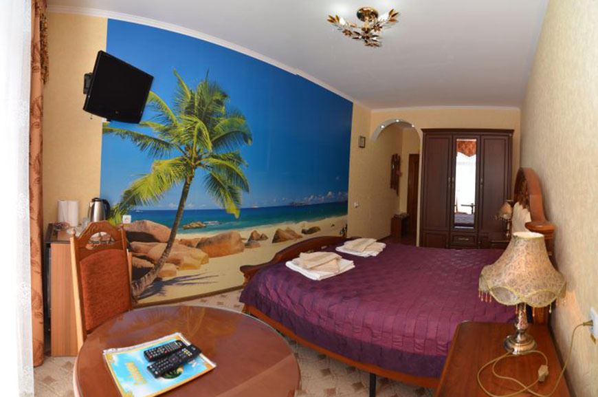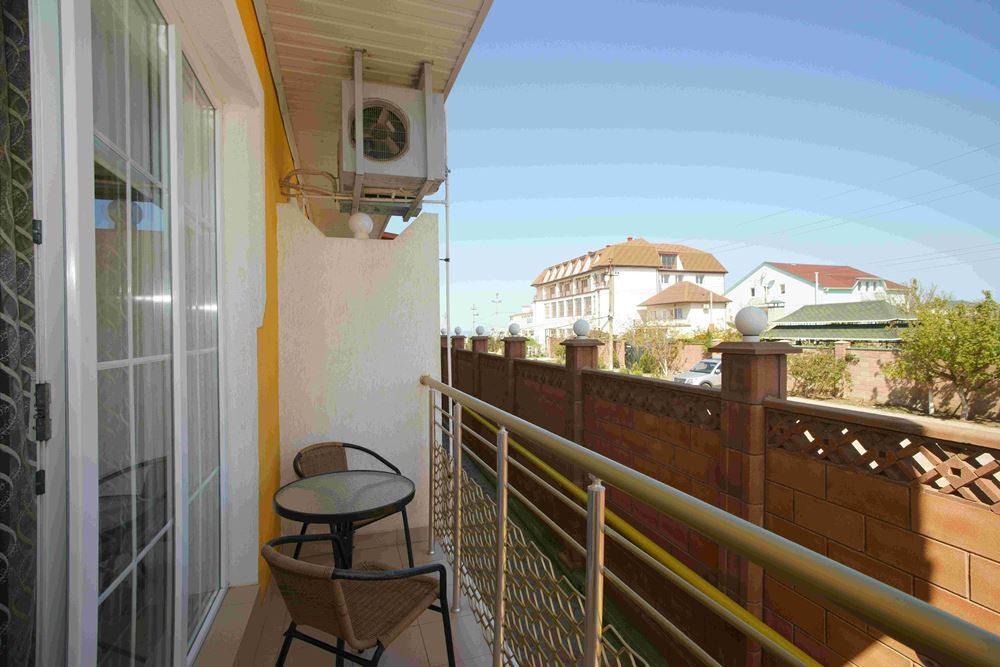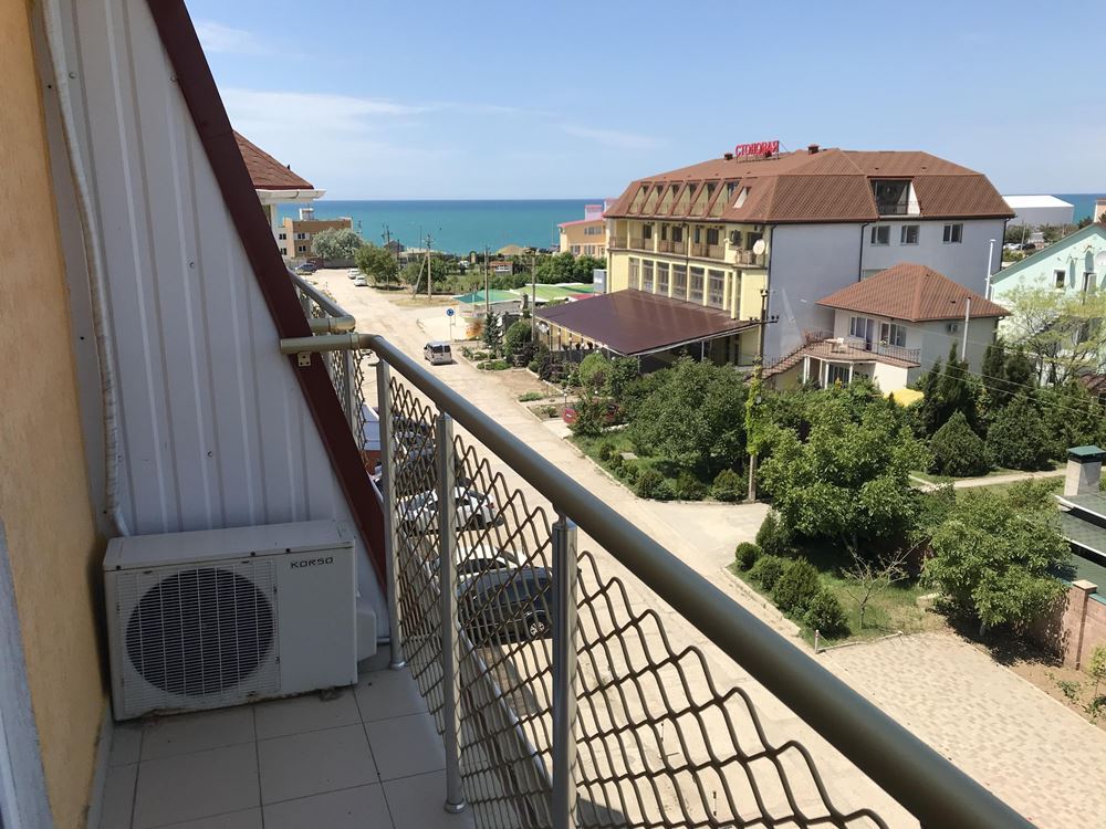 Четырехэтажный корпус отеля занимает небольшую закрытую территорию в 600 метрах от моря. Просторный жилой фонд предлагает однокомнатные и двухкомнатные номера со всеми удобствами. В каждом номере предусмотрен санузел с душем, есть кондиционер, отлично справляющийся с крымской жарой, телевизор и холодильник.