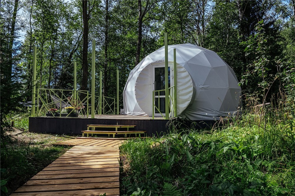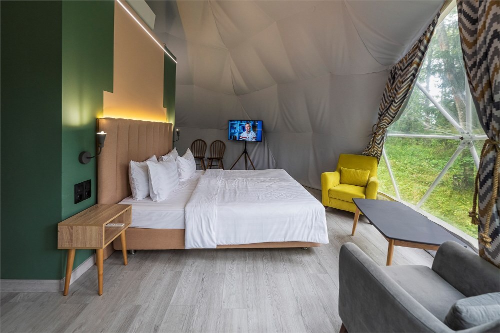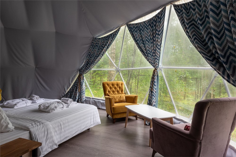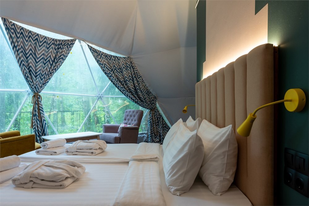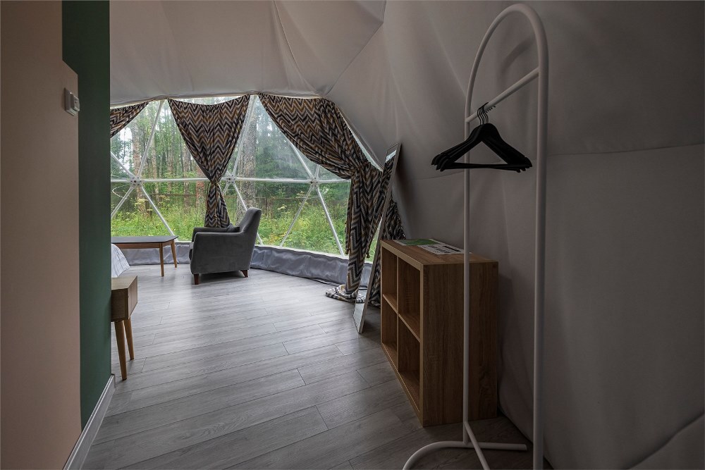 Гостям предлагается размещение в таунхаусах и купольных глэмпах. В домиках предусмотрены: уютная гостиная, спальня, в которой хочется провести все выходные, удобная ванная комната, и большая терраса, где можно насладиться чашечкой кофе. В каждом куполе есть душ с горячей водой и уборной, а также тапочки, махровые полотенца, халаты, средства для ванной. Особенный комфорт создают полы с подогревом, как в комнате, так и в ванной. Кроме внутреннего уюта, каждый купол имеет свою собственную веранду с удобной мебелью — столиком и стульями, чтобы встречать теплые дни на свежем воздухе.