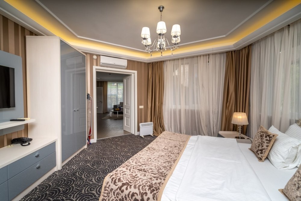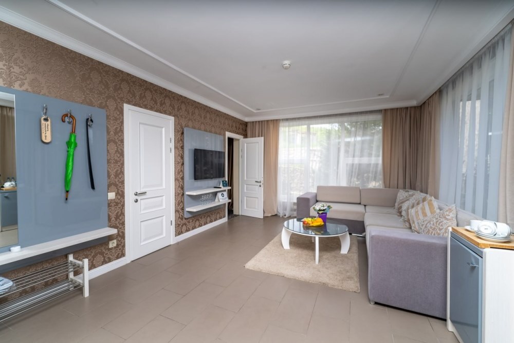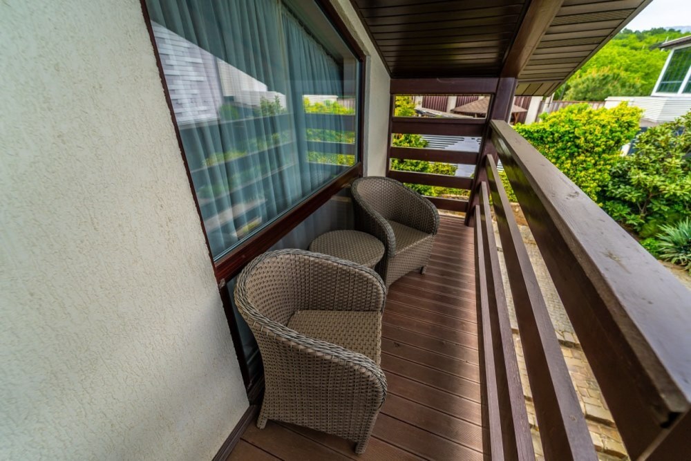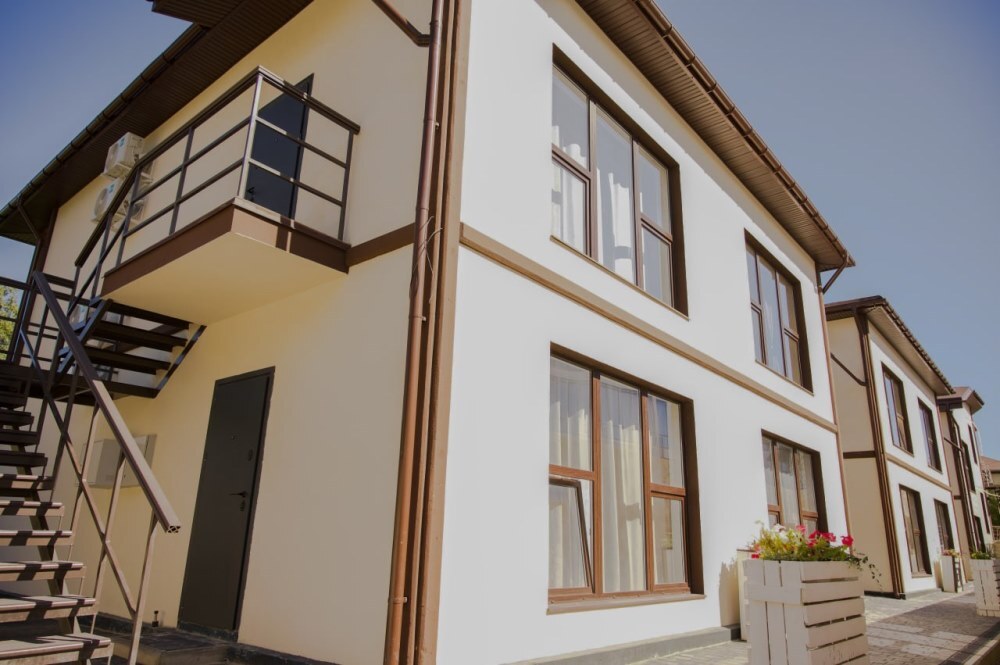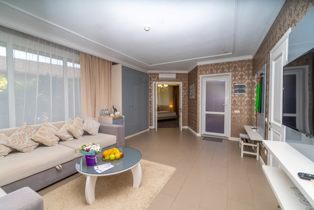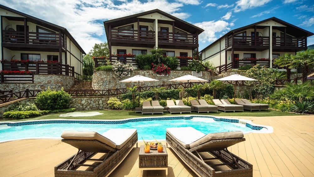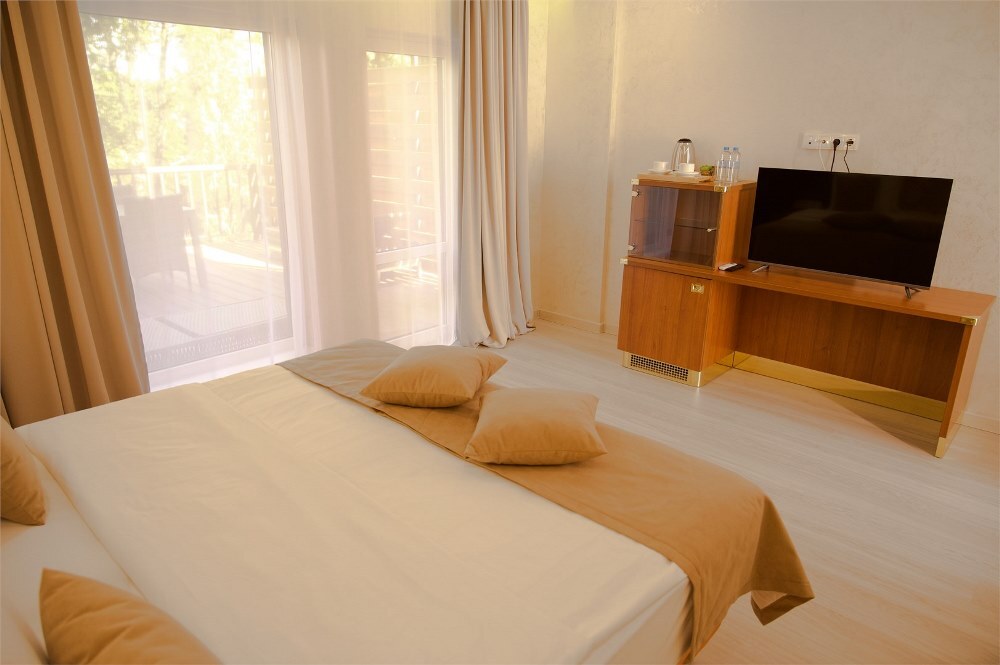 Отель занимает зеленую территорию, окруженную плодовыми деревьями: растут яблони, груши, персики, виноград. Для размещения гостям предлагаются двухэтажные виллы с каменными террасами, а также номера в гостевом корпусе. На виллах предусмотрена мини-кухня, есть два санузла, в гостевых номерах – классические интерьеры, оформленные в пастельных оттенках, ест вся необходимая мебель и техника: кондиционер, телевизор-ЖК, электрочайник, мини-холодильник, фен. В ванной комнате подготовлены косметические наборы, халаты и тапочки для гостей.