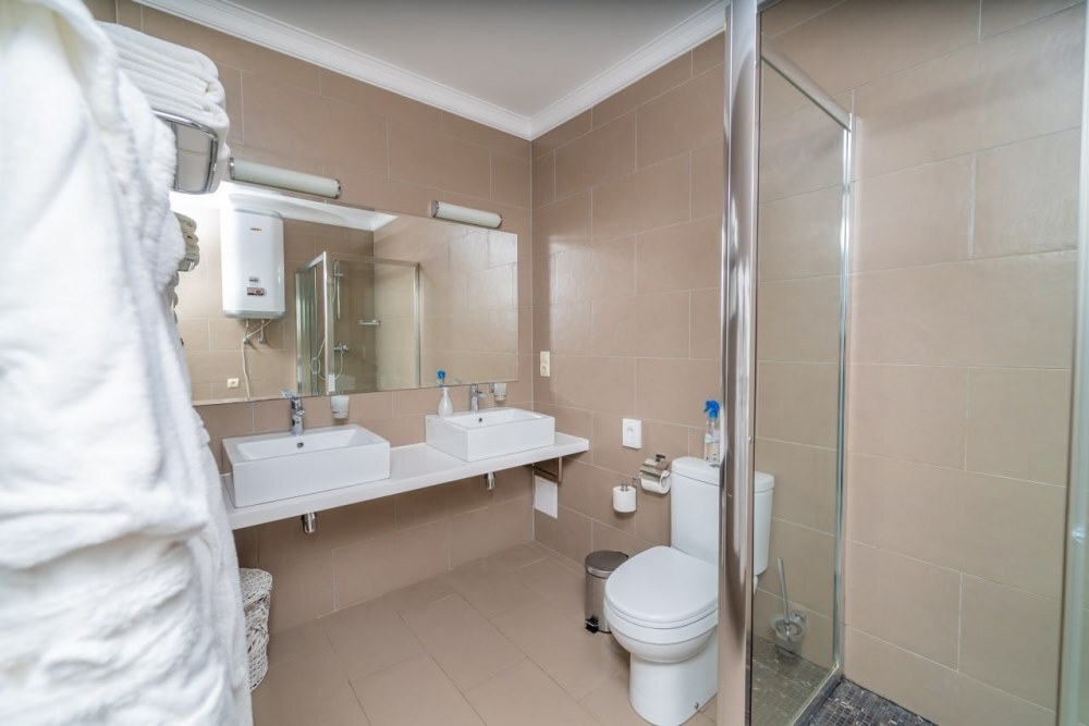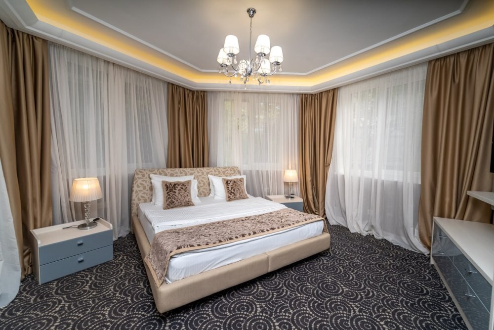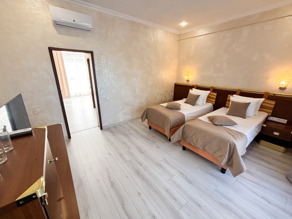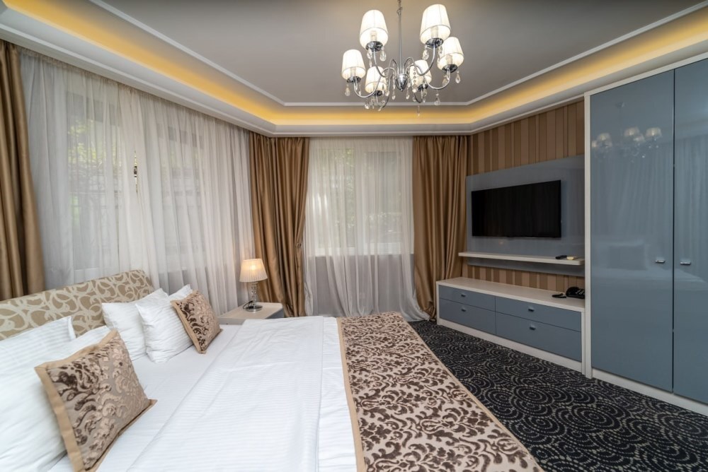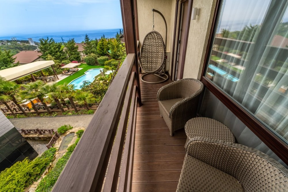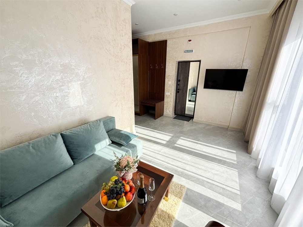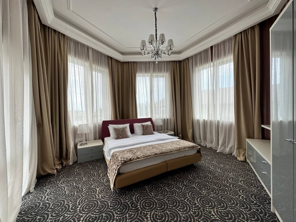 Отель занимает зеленую территорию, окруженную плодовыми деревьями: растут яблони, груши, персики, виноград. Для размещения гостям предлагаются двухэтажные виллы с каменными террасами, а также номера в гостевом корпусе. На виллах предусмотрена мини-кухня, есть два санузла, в гостевых номерах – классические интерьеры, оформленные в пастельных оттенках, ест вся необходимая мебель и техника: кондиционер, телевизор-ЖК, электрочайник, мини-холодильник, фен. В ванной комнате подготовлены косметические наборы, халаты и тапочки для гостей.